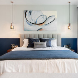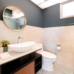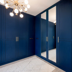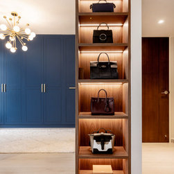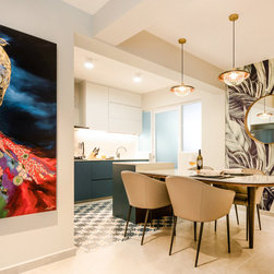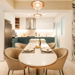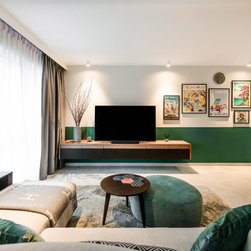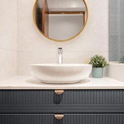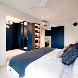 While the bedroom achieves a dynamic design with a recipe of wood, gray and lightness paired with navy blue, the fitted wardrobe with golden accents being inserted on the handle as well as light fixtures surely increase the sumptuousness of the interior. In all, bold in its aesthetic, this apartment design discards the rulebook and allows for creativity to take over.