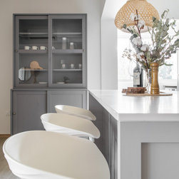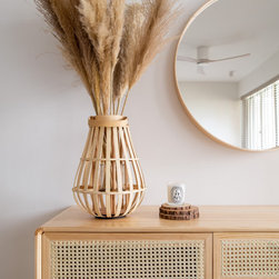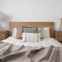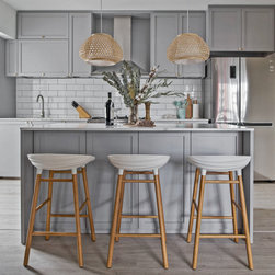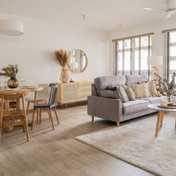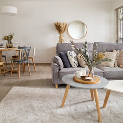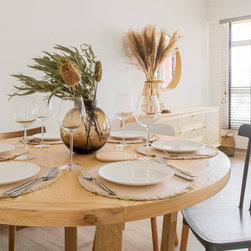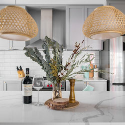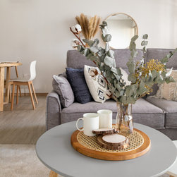 If you like airy spaces then this Scandinavian-themed apartment is the one for you. On top of white walls, the space is contrasted with natural materials such as woven rattan details for the cabinets in the living room and bedroom wardrobe and kitchen pendant lights. Also present are unpainted wooden furniture, dried flowers in amber vases, and natural fabrics such as linen and cotton that promote breathability. Lastly, the light grey kitchen cabinets paired with white subway tile backsplash have more of a modern farmhouse feel and seemed like a kitchen where everyone in the family would feel comfortable hanging out in.