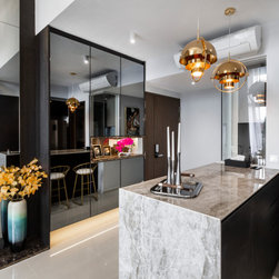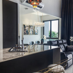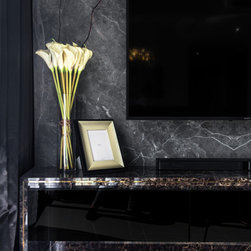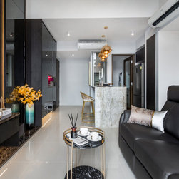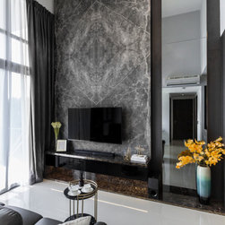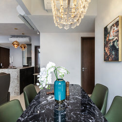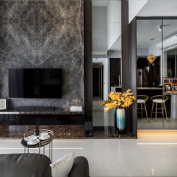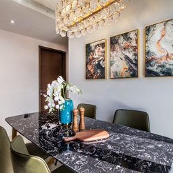 This house manifests the love for natural stone grains -- the first thing in this interior that catches the eye is the grey marble-look TV backdrop. An indeed low-key luxury. Next on is the glossy, dark-hued dining tabletop along with the framed artworks on the wall.