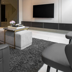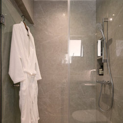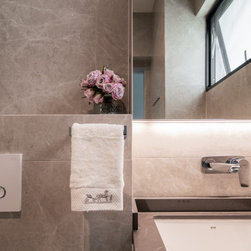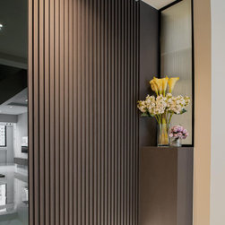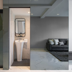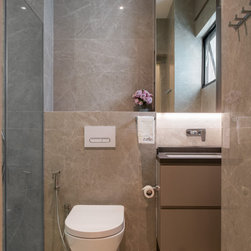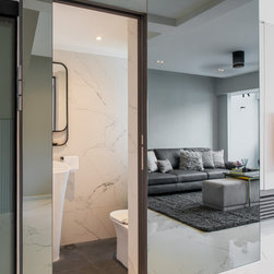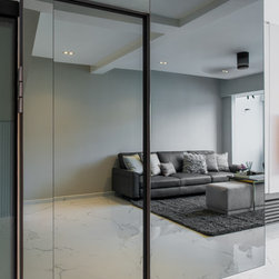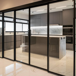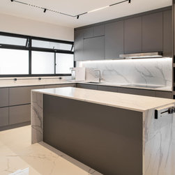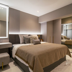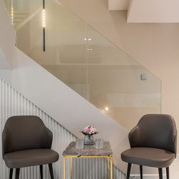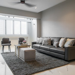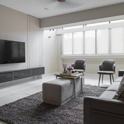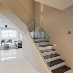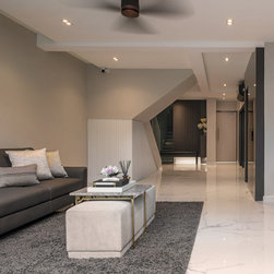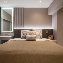 This Maisonette at Dakota Crescent is made to look more spacious than it is with the use of minimalistic greys, fully mirrored wall panels at entrances, and stripped of unnecessary décor and styling throughout the home. Instead, what you can see at this place is the focus on architectural details such as functional ambient lighting to subtly illuminate the stairs area, usage of quality wall materials like fluted and mirror panels, and elegant use of glass at the stairs railing, frosted divider screens, as well as movable door panels that open up the kitchen area.