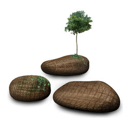 The Binhi collection consists of rattan furniture molded into rounded organic shapes. Life erupts from these vessels as crawling greens grow from within them.