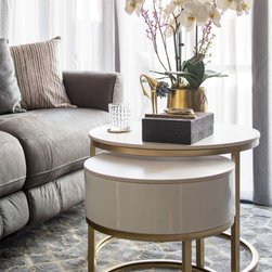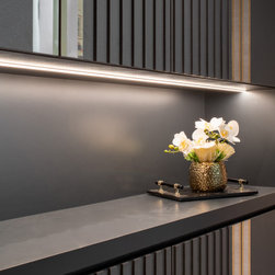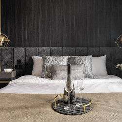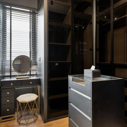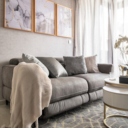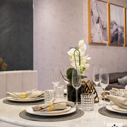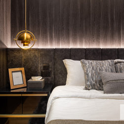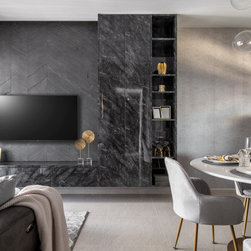 The luxurious built-in TV console with its glorious marble veining has open shelvings to display lovely accessories. Gold elements are speckled around the house like little flakes to give it a warm pop against this bold colour palette.