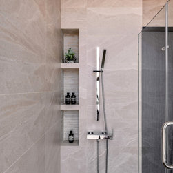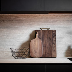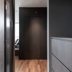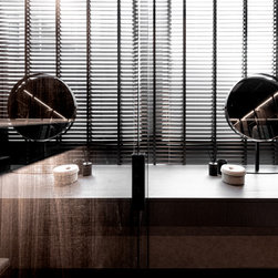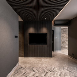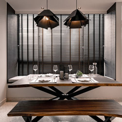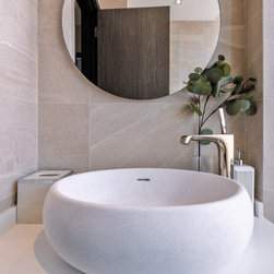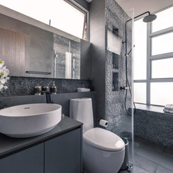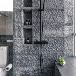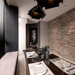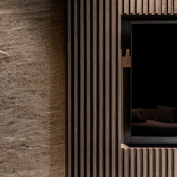 Organic tactile stone surfaces, granite stone walls and herringbone wood grain floors could be found all at once in this interior. While the brick wall in the dining area gives off a more rustic feel, the bathroom walls are kept simple for a clean-cut look.