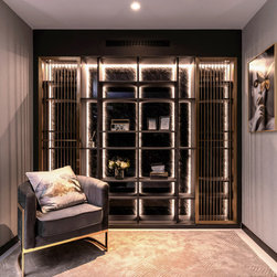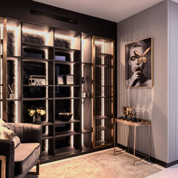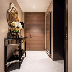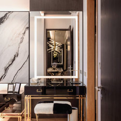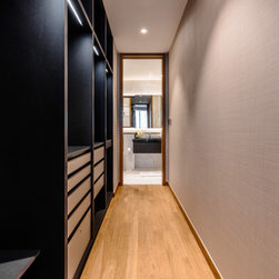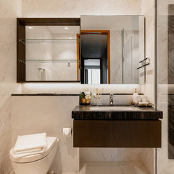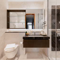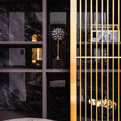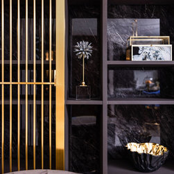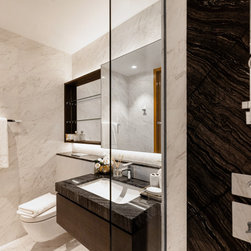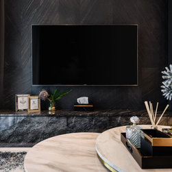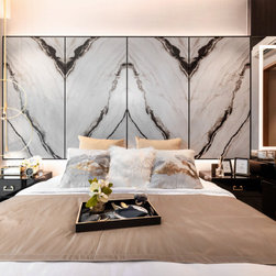 Magnificent marble feature walls and table tops swirl across the astonishing living room and dining room, and thread through an open and luxurious hallway with a large kitchen island that sits opposite the entertainment area. Where the marble slabs end, dark wood panels take over to create uniformity of the remaining walls, interior doors, and storage solutions. The personal spaces are also not separated from the home thematically despite its comfort-centric styling.