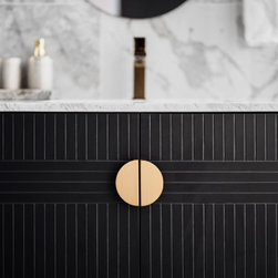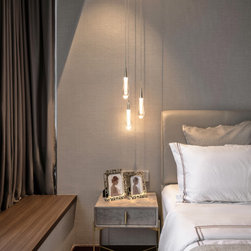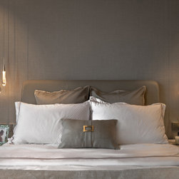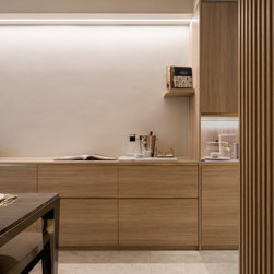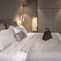 A full stretch of built-in cabinets from the kitchen to the dining room allows for more storage and a brilliant way for the owner to display her bakes. Textured wallpaper in the bedroom softens the space against the contrasting dark parquet floor.