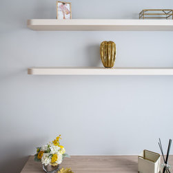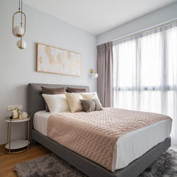 The lush grey carpet and bed accessories give some texture to the bedroom to achieve a casual elegant look.