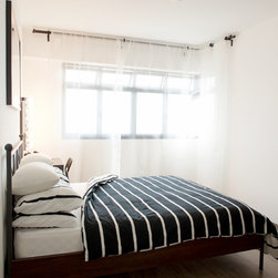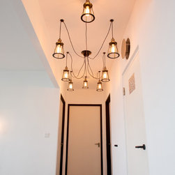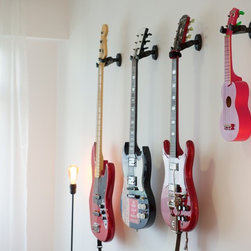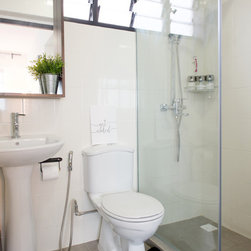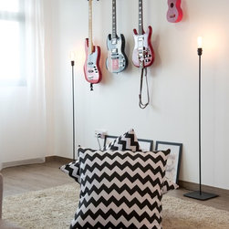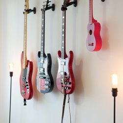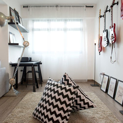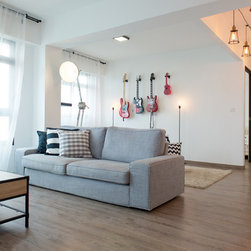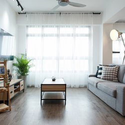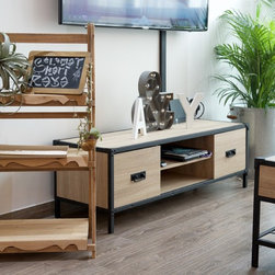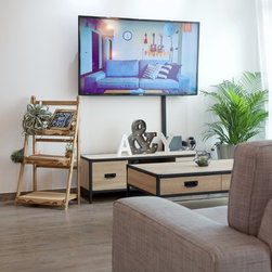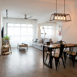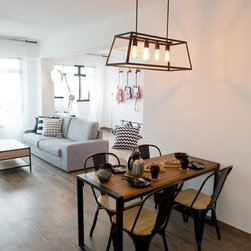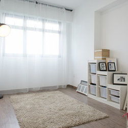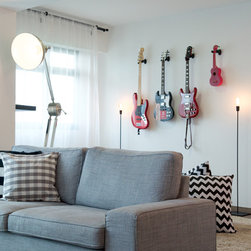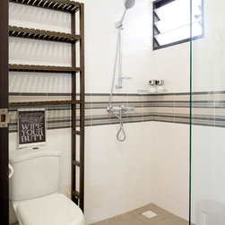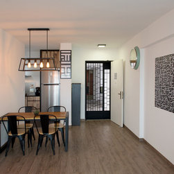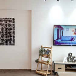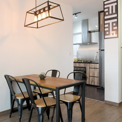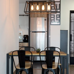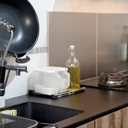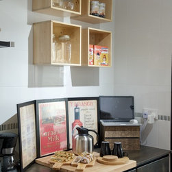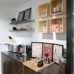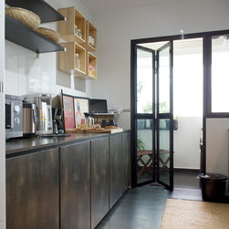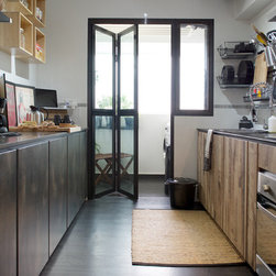 Flat panel medium brown cabinets with a Bi-fold door for the service yard.
