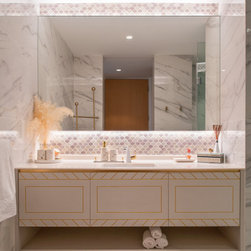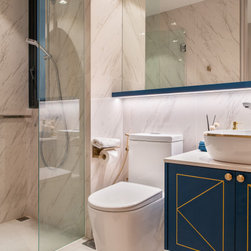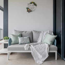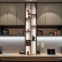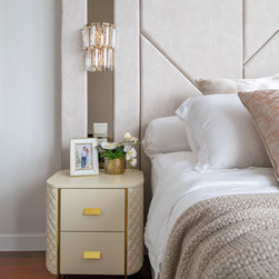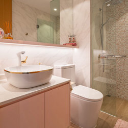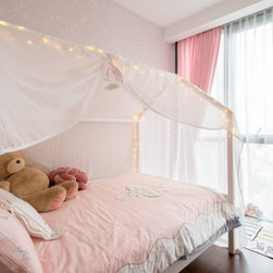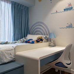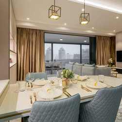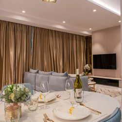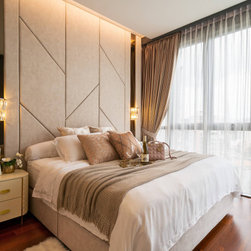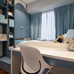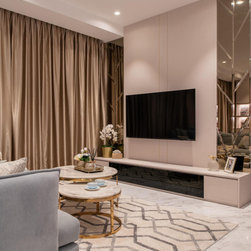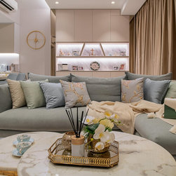Gorgeous and sophisticated is the gist of this spacious beige and gold apartment at The Arte with its subtle tint of rosy pink and ocean blues in the furnishings and cabinetry. These very subtle hues are then made prominent in the children’s bedroom with a pink room with a home-shaped poster bed for the daughter and a blue ship theme room with a custom bed design for the son.