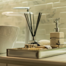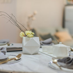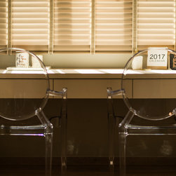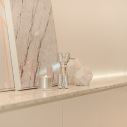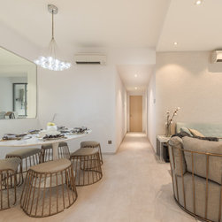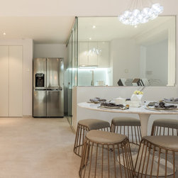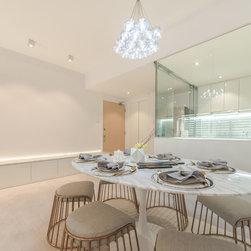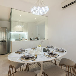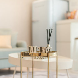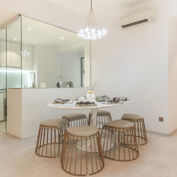 To mix modern Scandinavian elements with a tinge of local "Kopitiam" flavour, we replaced the usual mid-back dining chairs with Bride's Veil smoked brass backless low stools instead.