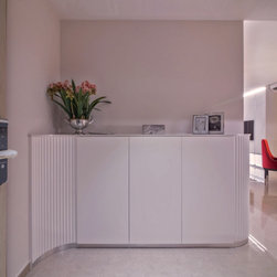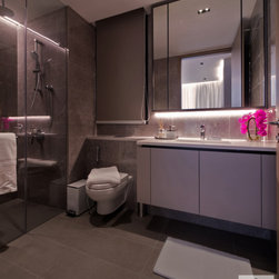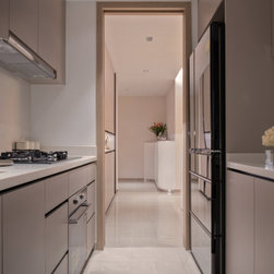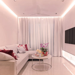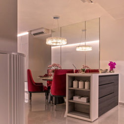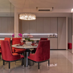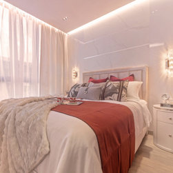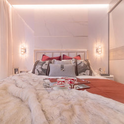 This sleek and silver sanctuary is romanticised with crimson red accessories. The marble panels on the TV console make an elegant feature. The pristine ambiance is replicated in the bedroom with glittering marble laminate and crystal wall lights.