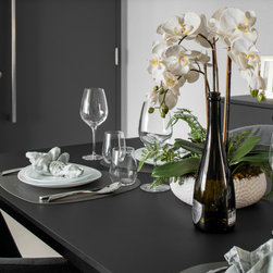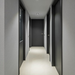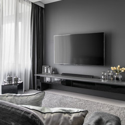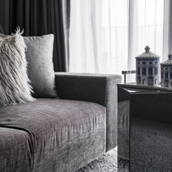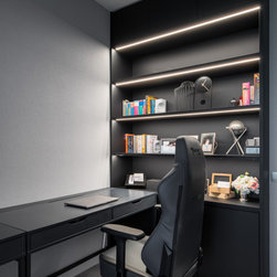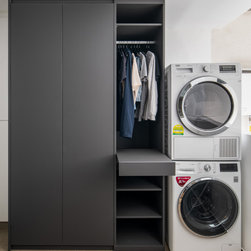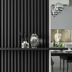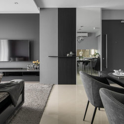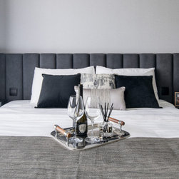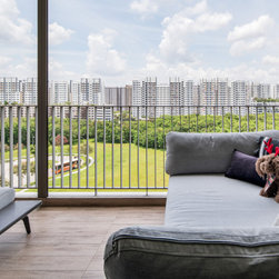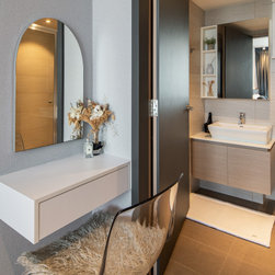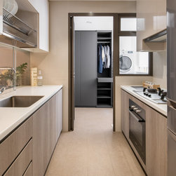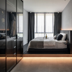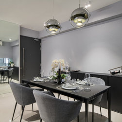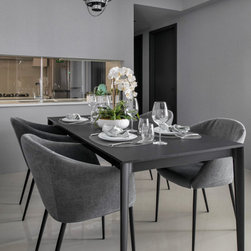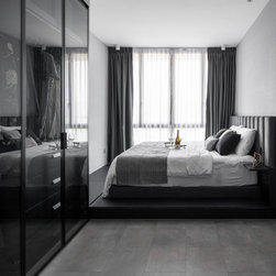 A polished, gleaming floor is a great canvas for this Modern Contemporary home with a variation of stone colours. Fluted panels and open shelvings with mirrors create the illusion of a bigger space. The master bedroom has a built-in platform to create storage with individually customised strip cushions in the bedhead.