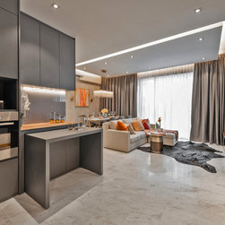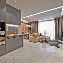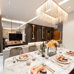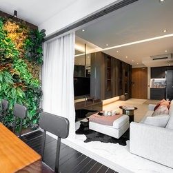 One of their first tasks was to address the owners’ concerns over their feline friend adapting to the new space. “As the space needs to be pet-friendly, we sourced for suitable fabrics for the home’s sofa upholstery and furniture,” say the designers. Effortlessly incorporating these features into the home’s overall aesthetic, the home makes a striking impression with its mix of plush furnishings and tropical elements.