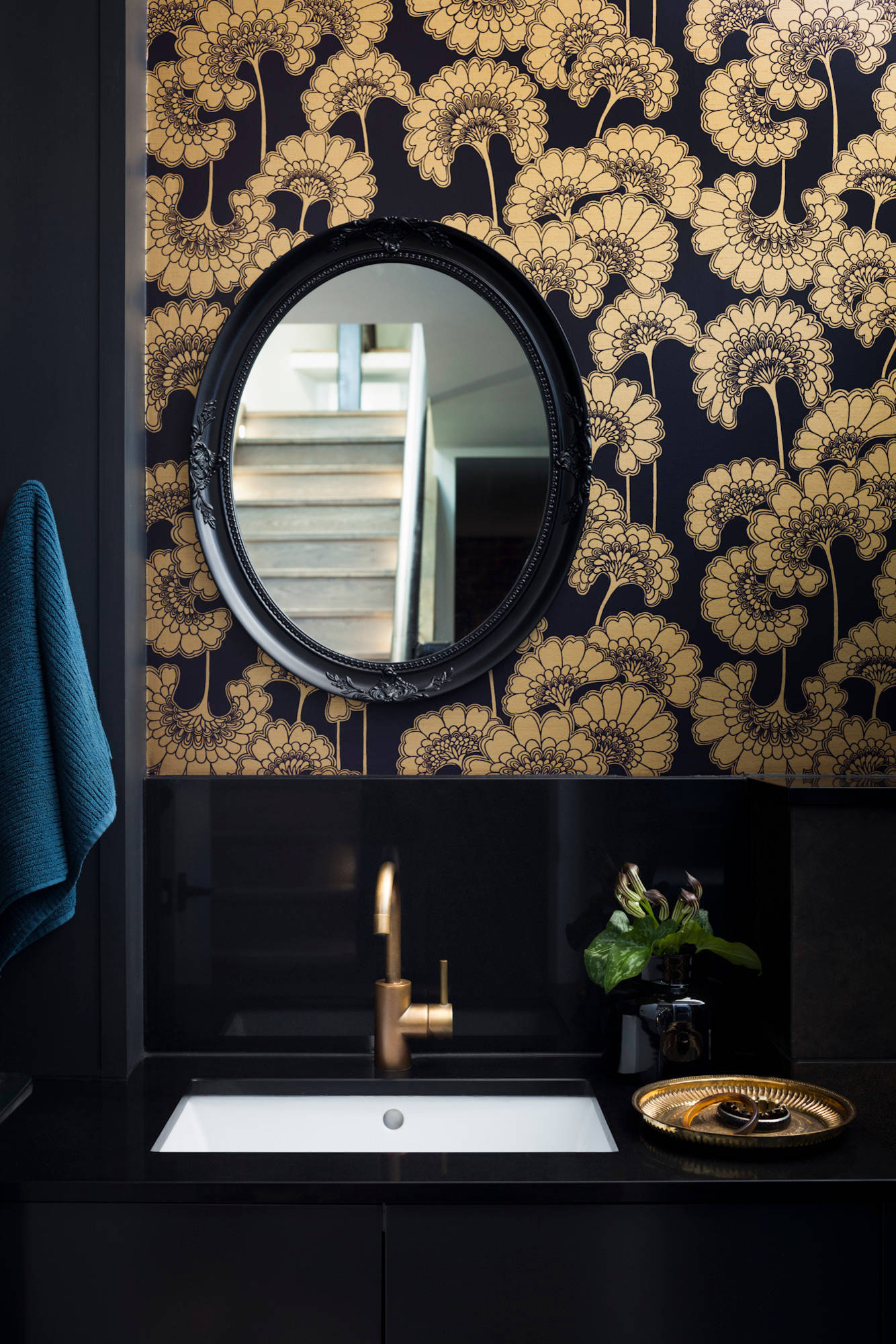 A bold, dark wallpaper with a distinctive Deco theme creates an elegant flourish and hints at sumptuous grandeur. Don’t be afraid to go dark in a small space, it will add to the drama and make the tiny space more captivating.