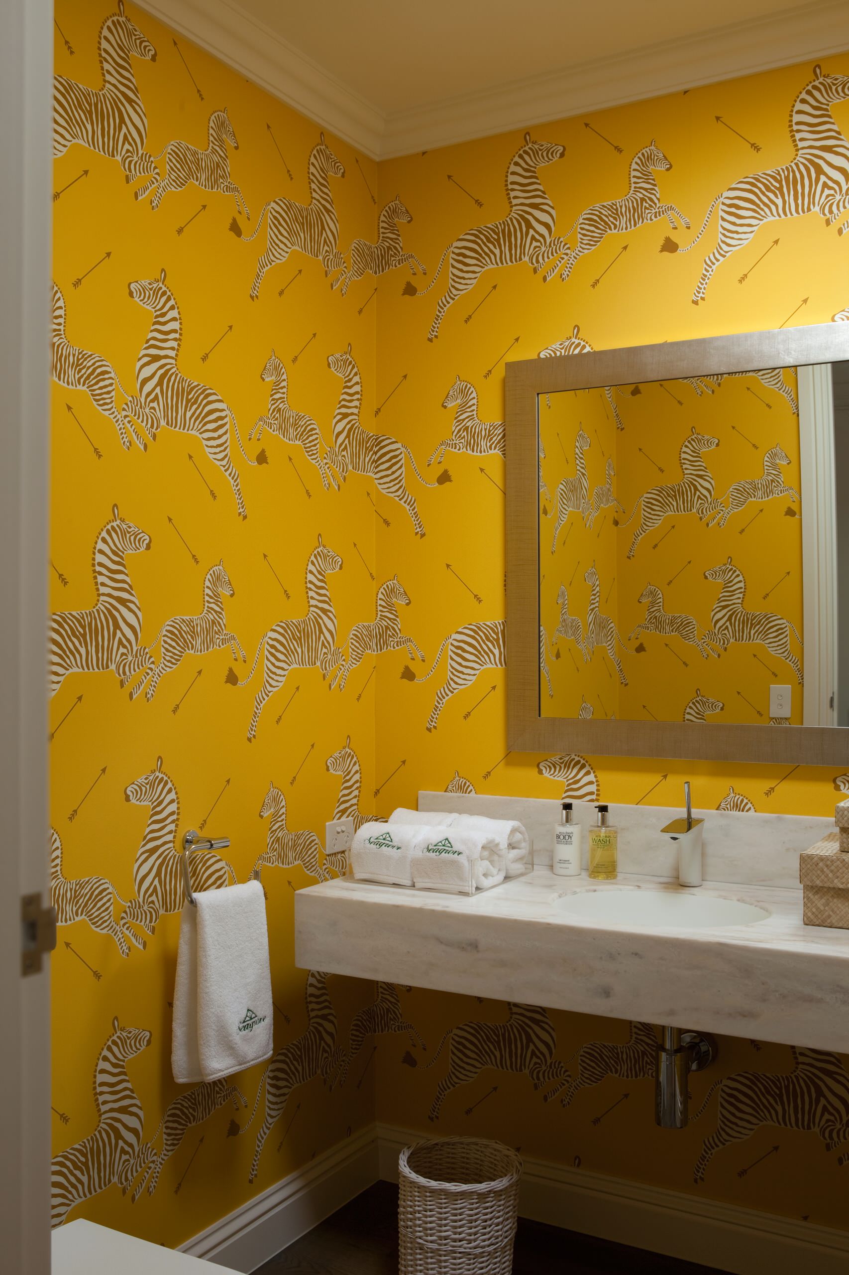 The Deco period also saw bright, rich colours decorate the walls, and one example is this stunning yellow wallpaper, originally designed by Flora Scalamandre in the 1930s. The deep intensity of the shade is upbeat and enriching to guarantee a happy vibe on every visit.