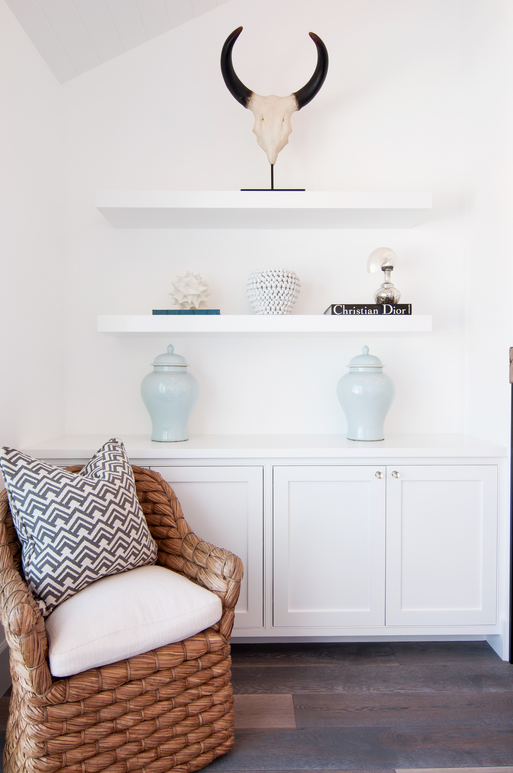 Stop a neutral scheme from falling flat by introducing interesting textures. This woven chair brings a hint of warmth thanks to its natural composition, which also makes this spot for one into the focal point of the space. For something similar, look for pieces made of jute or water hyacinth.