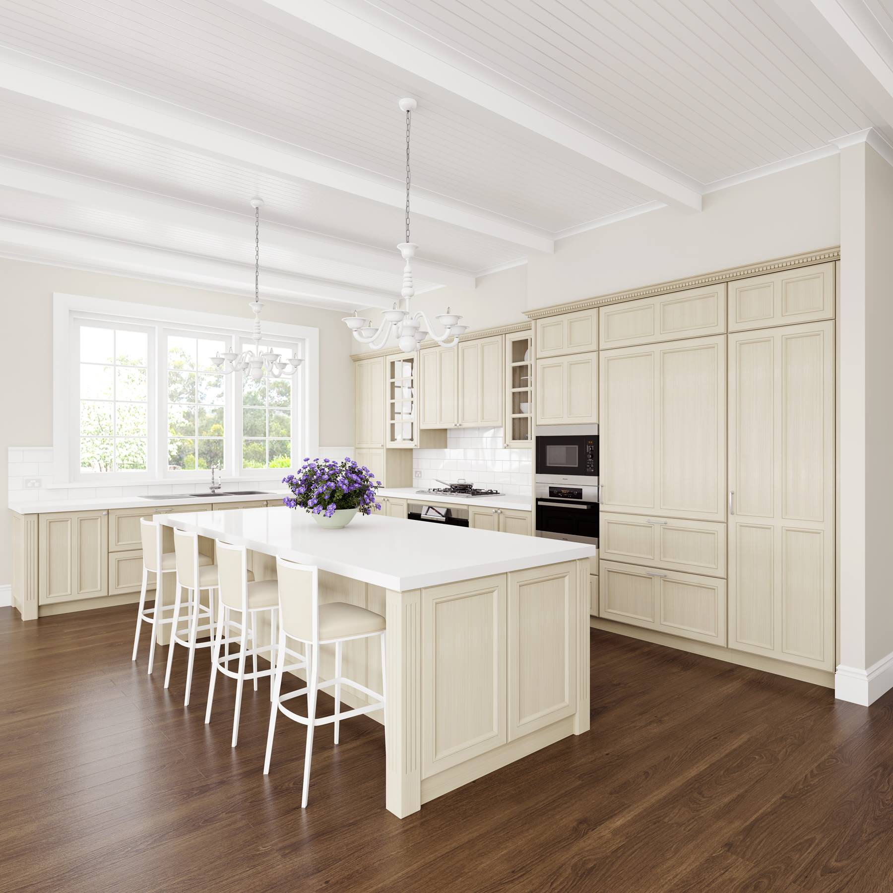 Traditionally, kitchen cabinets were constructed with a frame around the panel, and these are sometimes called shaker-style cabinets. These cabinets are popular in Hamptons kitchens because of their solid, traditional lines and detailing.