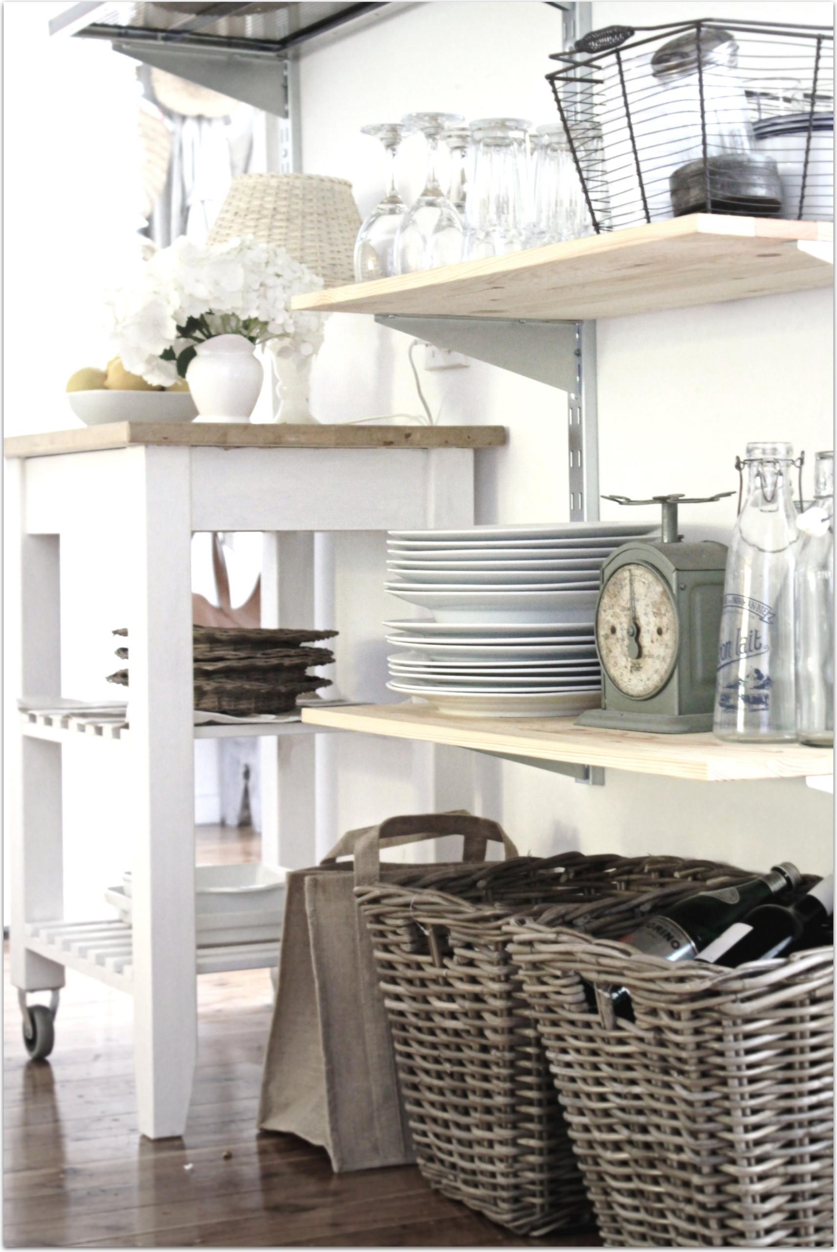 Open shelves are a great way to show off kitchenware, especially if the pieces are beautiful like these vintage scales and glass bottles. Cane baskets help keep clutter to a minimum, and store unsightly items while adding to the Hamptons vibe.