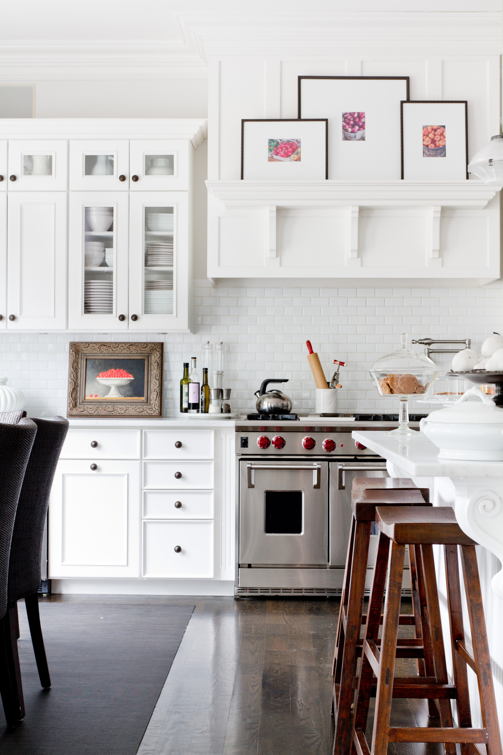This kitchen hallmarks all the classic Hamptons elements – from the beautifully detailed white cabinetry, large island and subway tiles to the dark floors, double oven and white crockery on display.