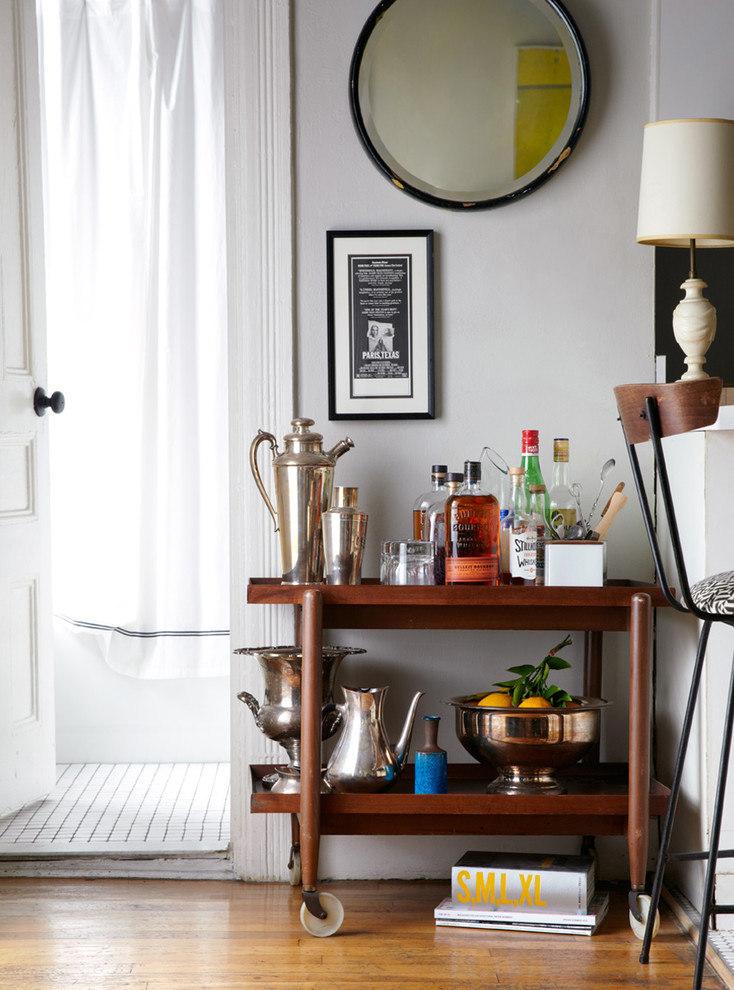 No hip New York-style apartment is complete without a space for socialising. The drinks trolley here is the ideal spot to stash a selection of cocktail ingredients, as well as some interesting silver essentials. Keep it tucked away ready to pull out to a central spot when needed.