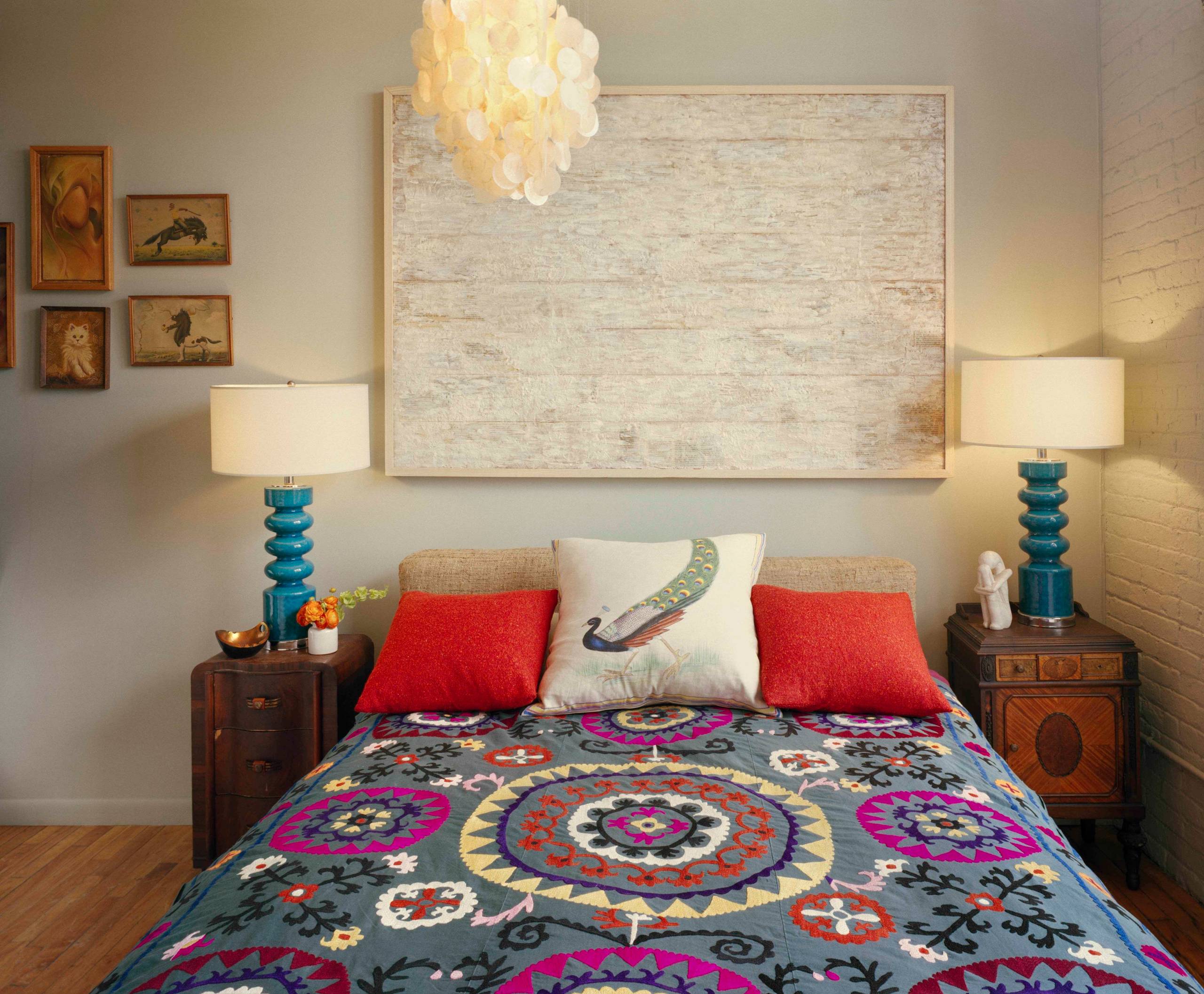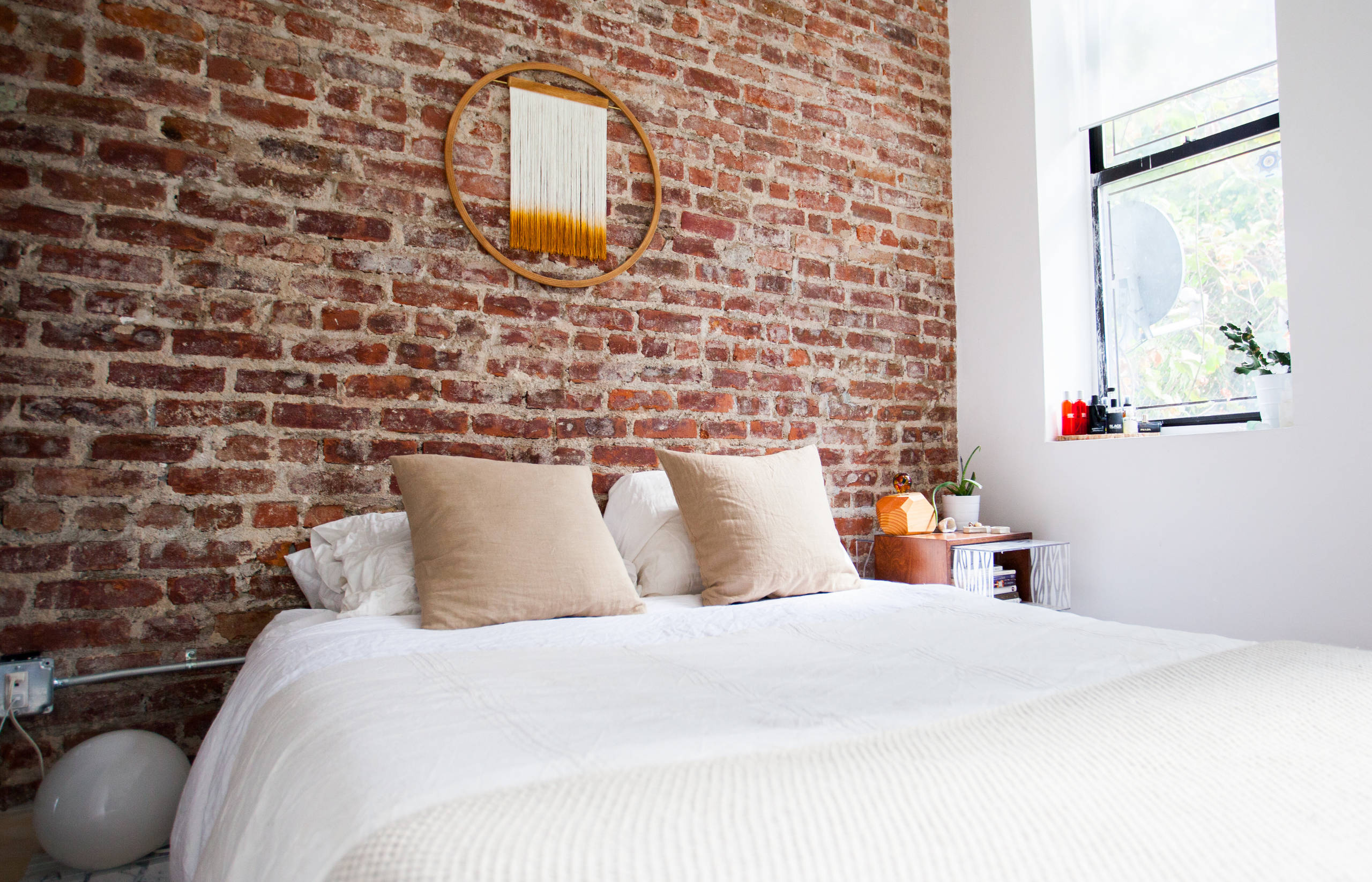 City apartments look great when they make the most of features that are part of the fabric of the building. In this hip Williamsburg bedroom, the exposed brick creates a warm backdrop to the neutral bed linen. A stylish wall hanging is a simple way to bring in a bohemian feel.
