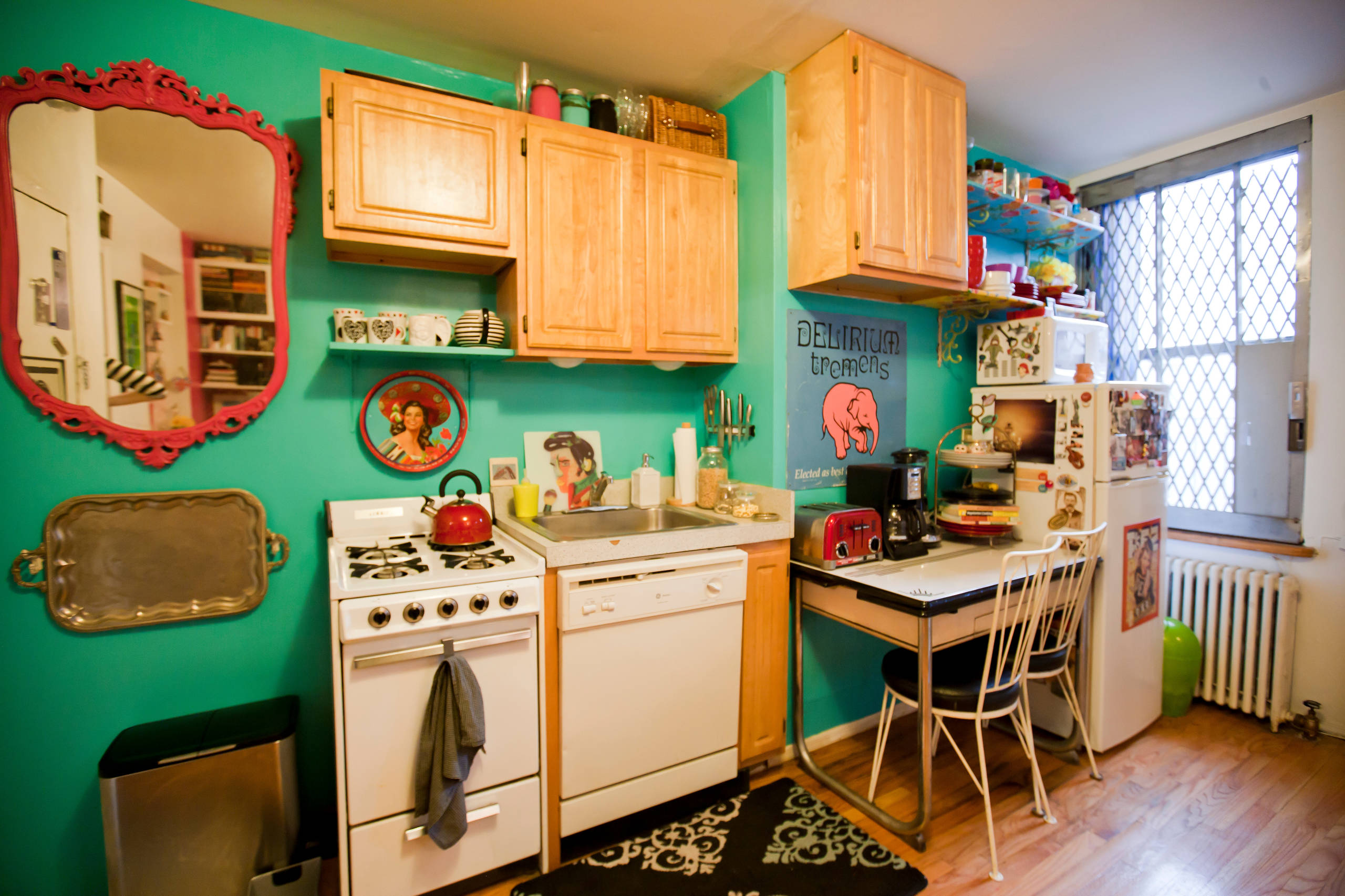 The painted walls in Girls’ lead character, Hannah’s, kitchen are a central element of the apartment. Hers are a soft blue, while the owner of this eclectic space went for a bright aqua green. Teamed with red artwork and accessories, the shade peps up an otherwise dull cooking zone.