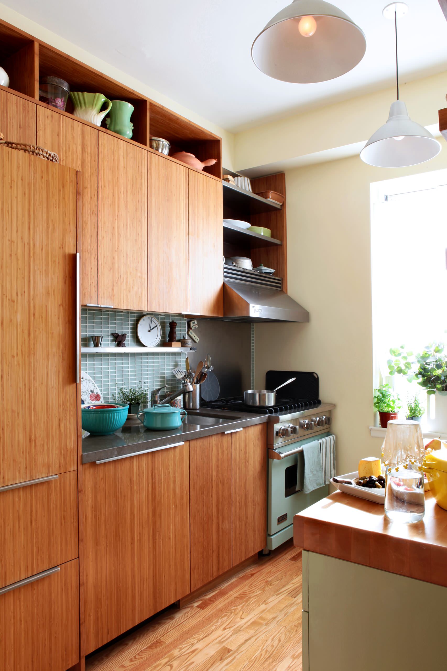 These veneered kitchen units add a retro feel to this New York apartment. To prevent the space looking too dark, the owners have popped in some duck-egg blue and teal in the form of a statement oven, splashback tiles and beautiful cookware.