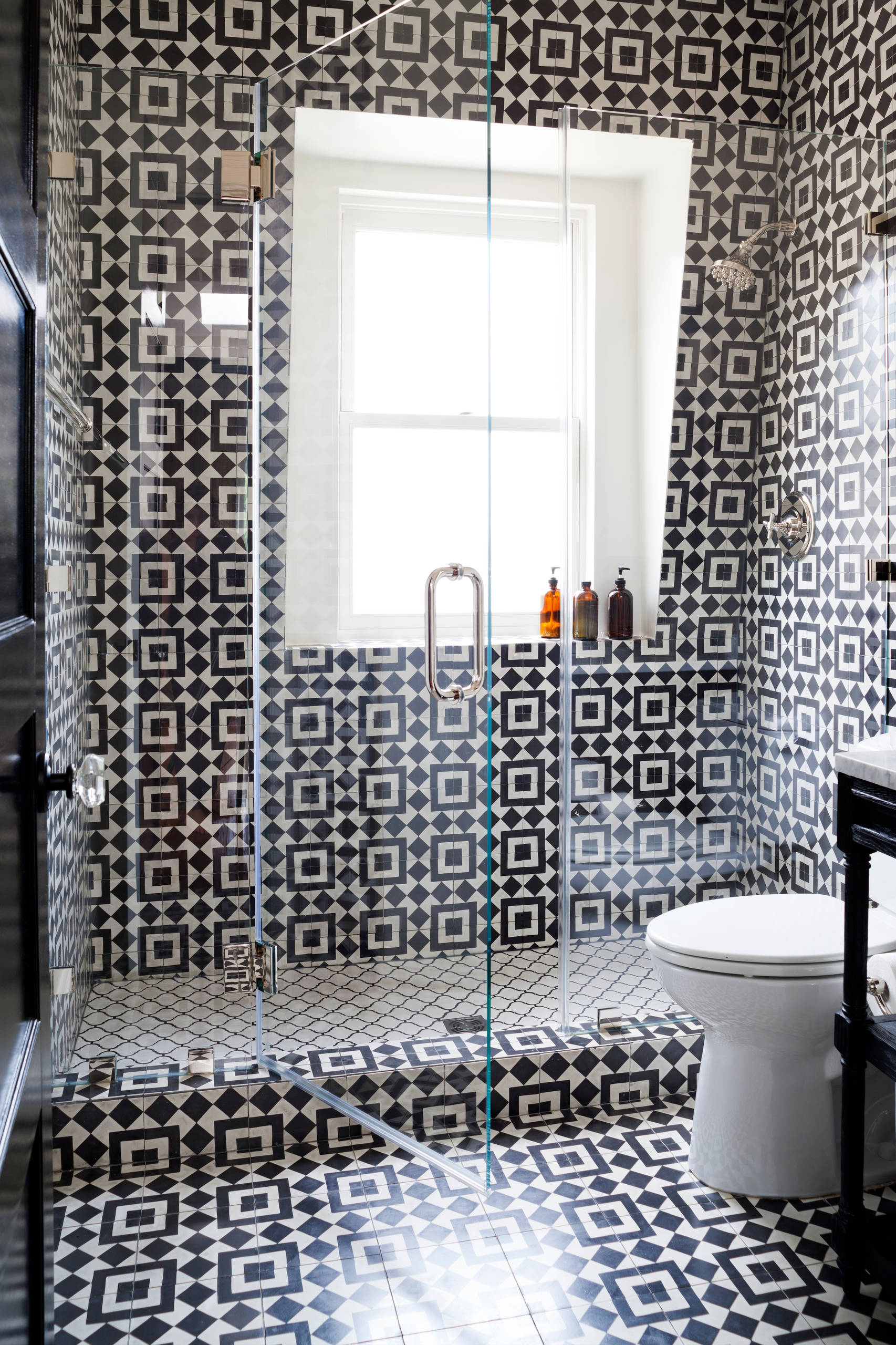 Repeating the same graphic black-and-white patterned tiles on the floor and walls of the bath creates a fresh, modern look that would work especially well in a small urban bathroom. In the space shown here, the expanse of black and white tile is broken only by a complementary pattern in a smaller scale on the shower floor.