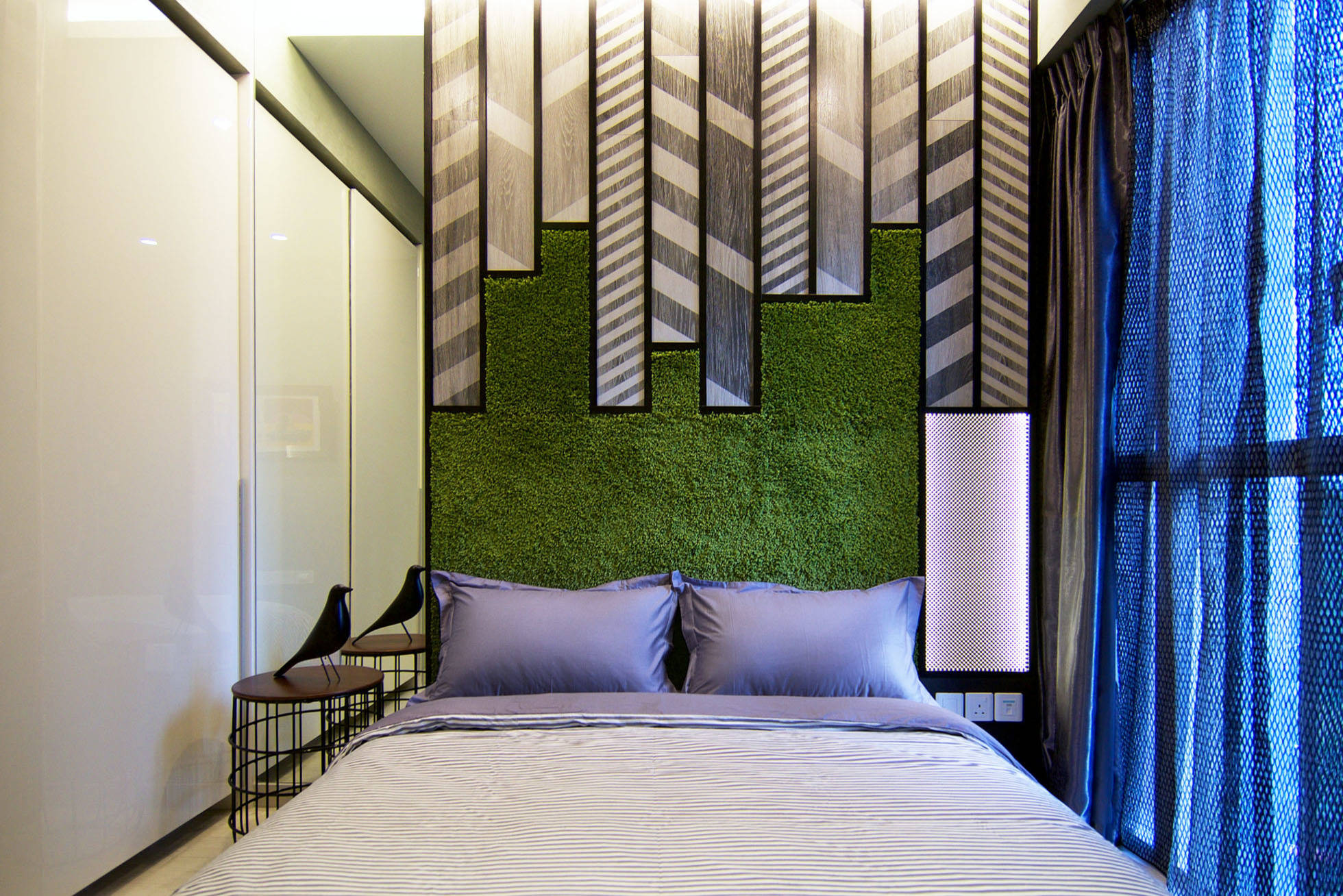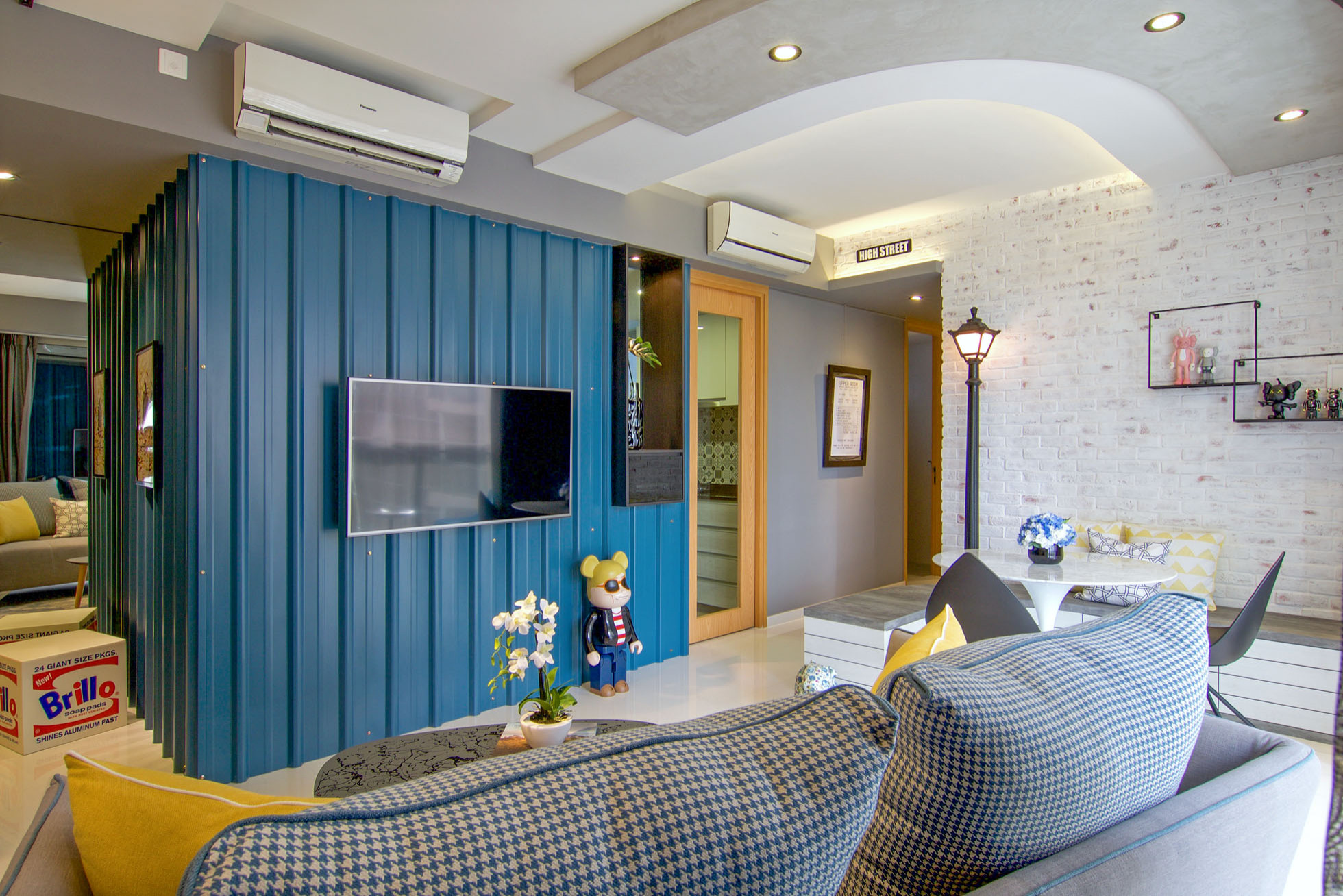 Designer Stanley Tham of KNQ Associates took inspiration from the owner’s collection of works by British street artists Miss Bugs, Eelus and Pahnl to give this three-bedroom condo in Bartley its edgy, streets-of-London look. Metal hoarding sheets used on the TV feature wall recreate a shipping container effect, while weathered, whitewashed craft brick on another wall provides an outdoor cafe ambience for the dining area.