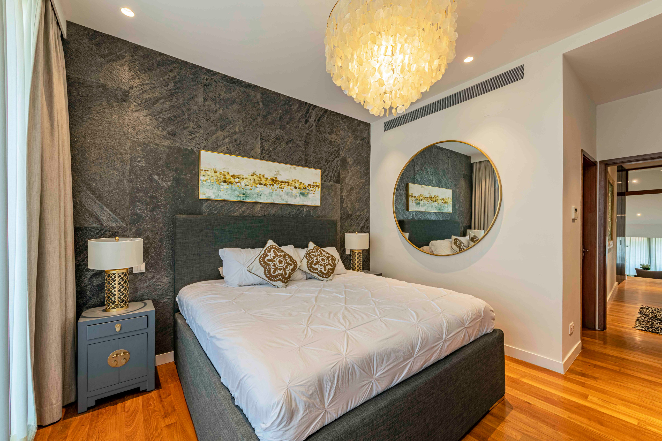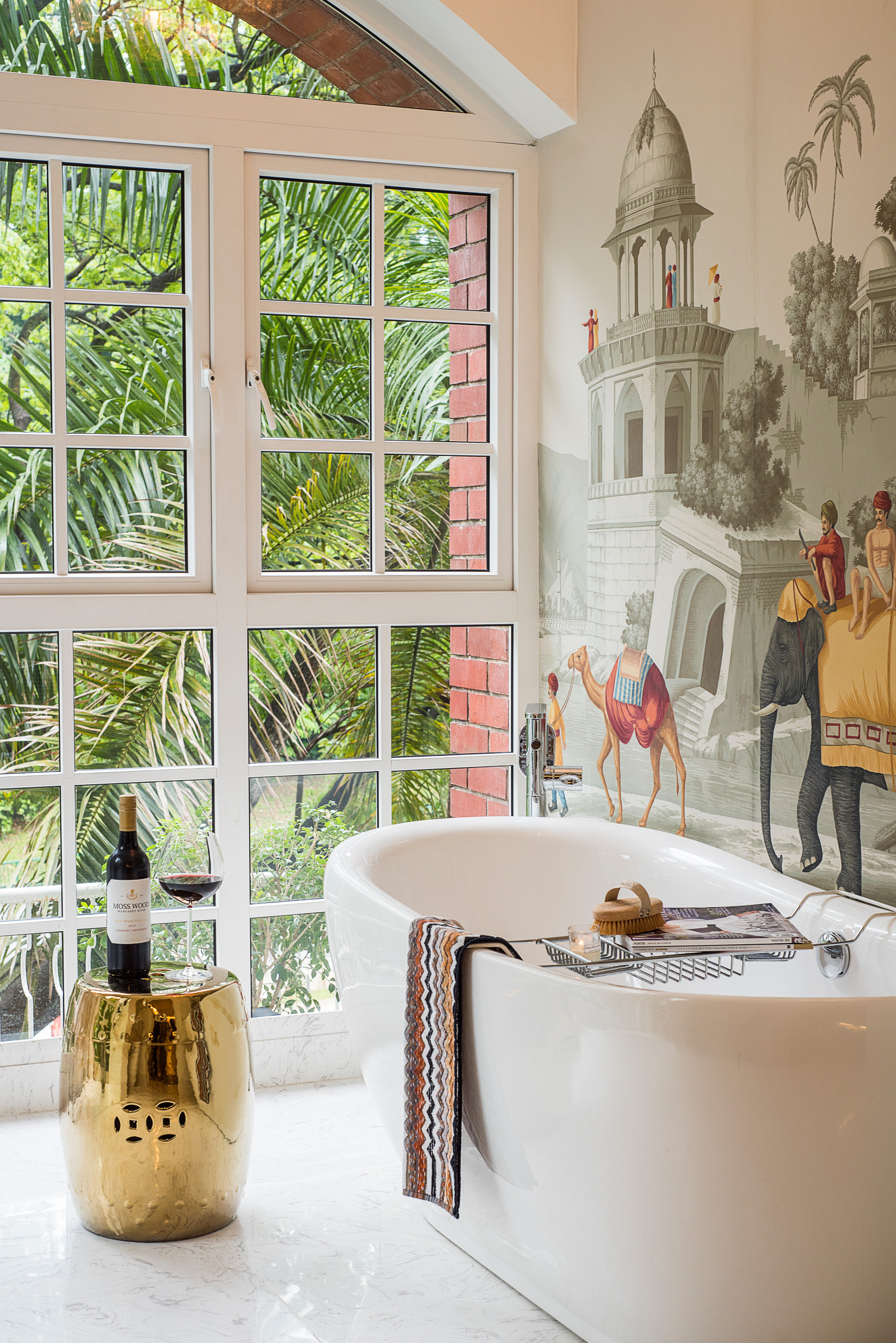 The British India theme, inspired by the country’s Moghul palaces, is a nod to her heritage. Wood-carved screens that act as fretwork, a hand-painted wallpaper print depicting a scene straight out of the British colonial era, and custom-made furniture bring the theme to life.