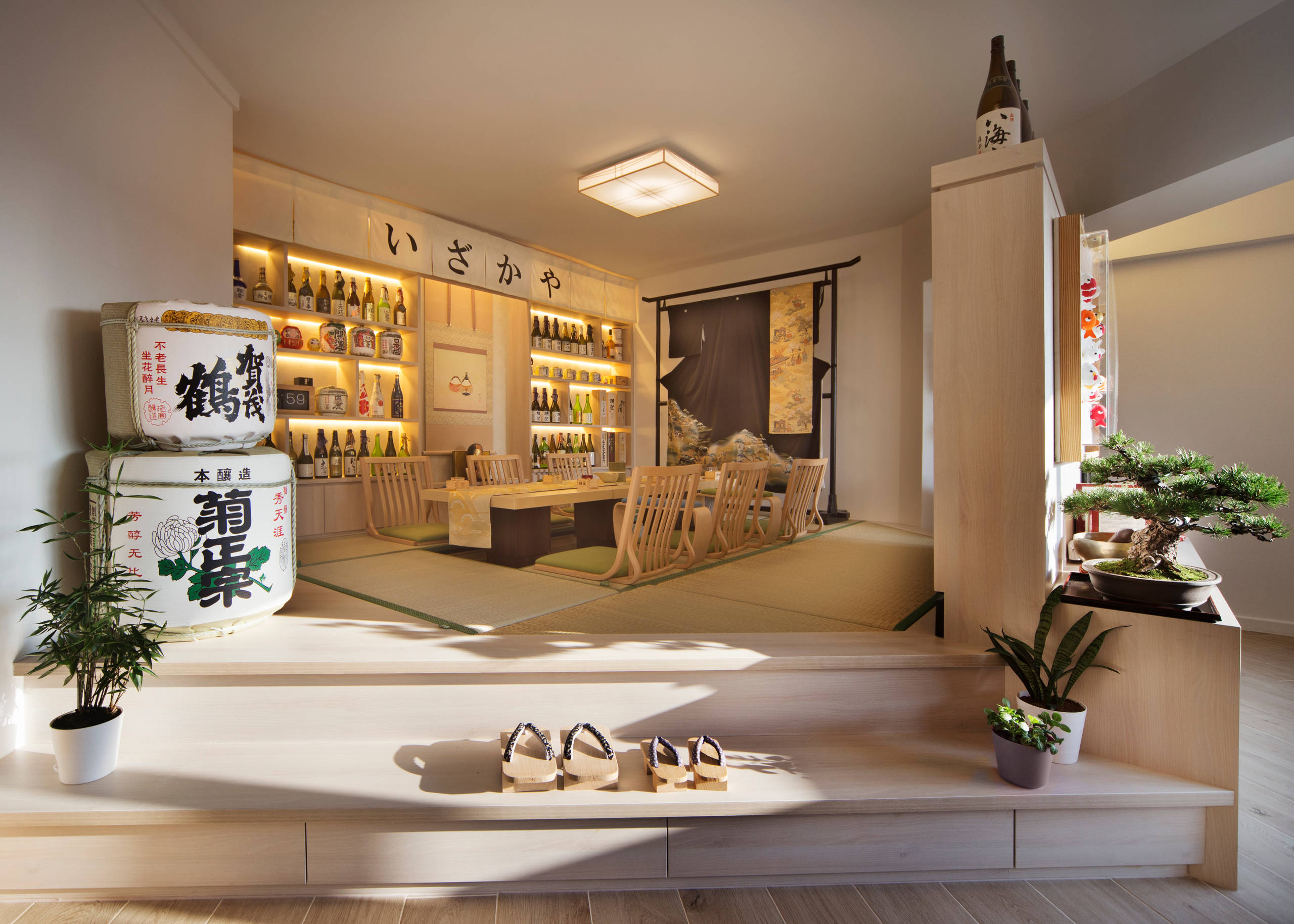 The kitchen was inspired by a sushi bar and there is a properly raised washitsu (a multipurpose Japanese room), shoji screens and tatami mats. The owner sourced many decorative items from Japan.