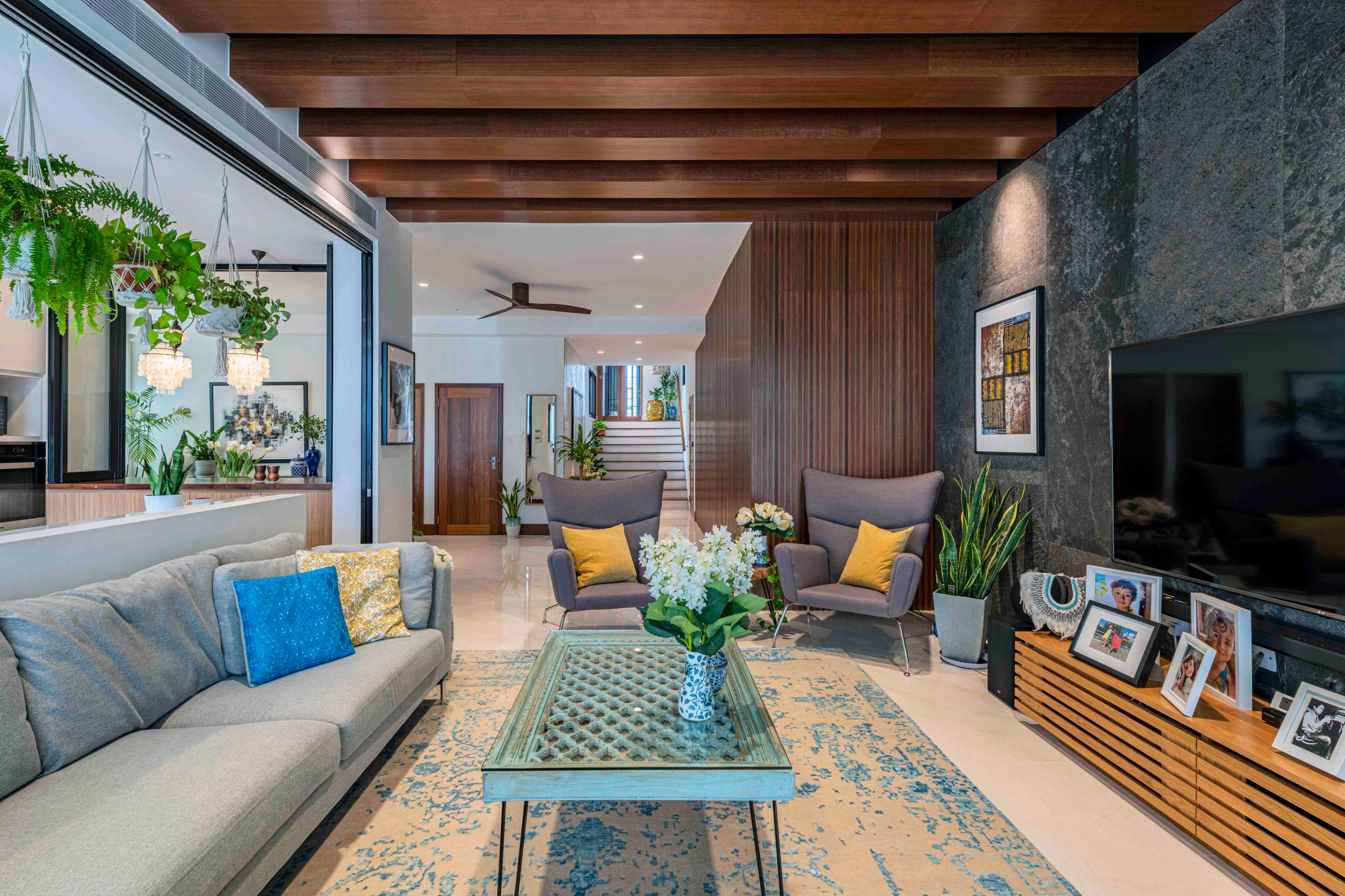 Designer Arjan Nijen Twilhaar of Aiden T transformed their four-bedroom condo in Joo Chiat by using nature-inspired elements such as wood veneer-clad faux beams and a feature wall in granite veneer. He brought plants into the open-plan communal area and added some pearlised detailing for that luxurious modern resort look.