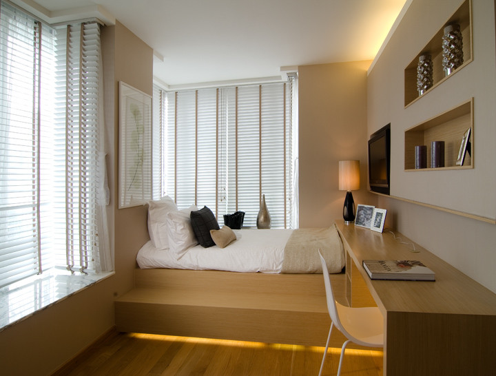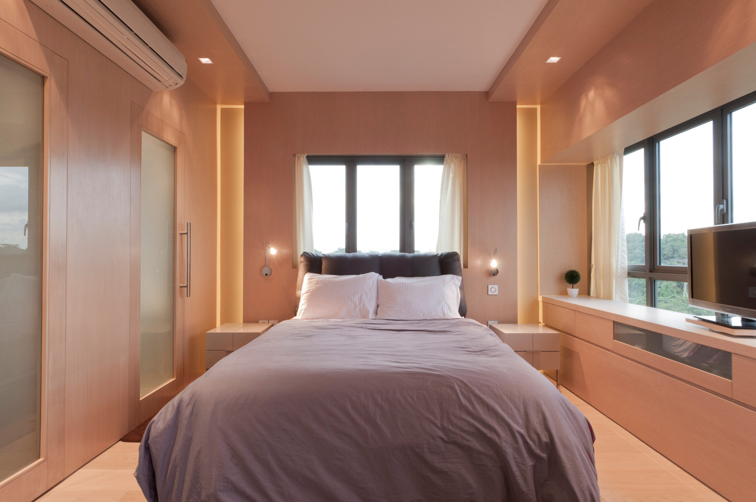 Maximise that bay window by incorporating it into your built-in bed’s design. Proj. B Studio used the length of the bay window for a comprehensive bedside bench-headboard-bedside table design: A wood veneer surface conceals the actual bay window seat, on which the bedside tables and the headboard are built.