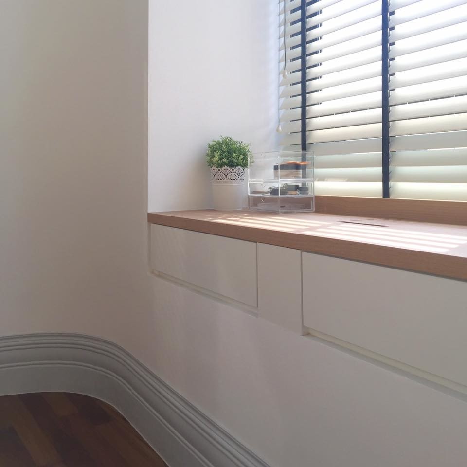 For this small corner room, designer Proj. B Studio maximised the two – albeit small – bay windows by joining them and building a study desk out of them. The corner creates leg space you normally wouldn’t have by simply adding another layer to make your bay window seat desk-height.