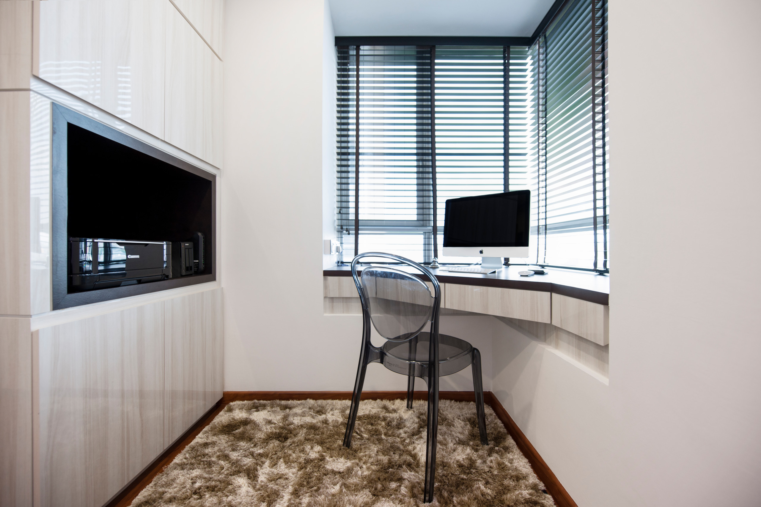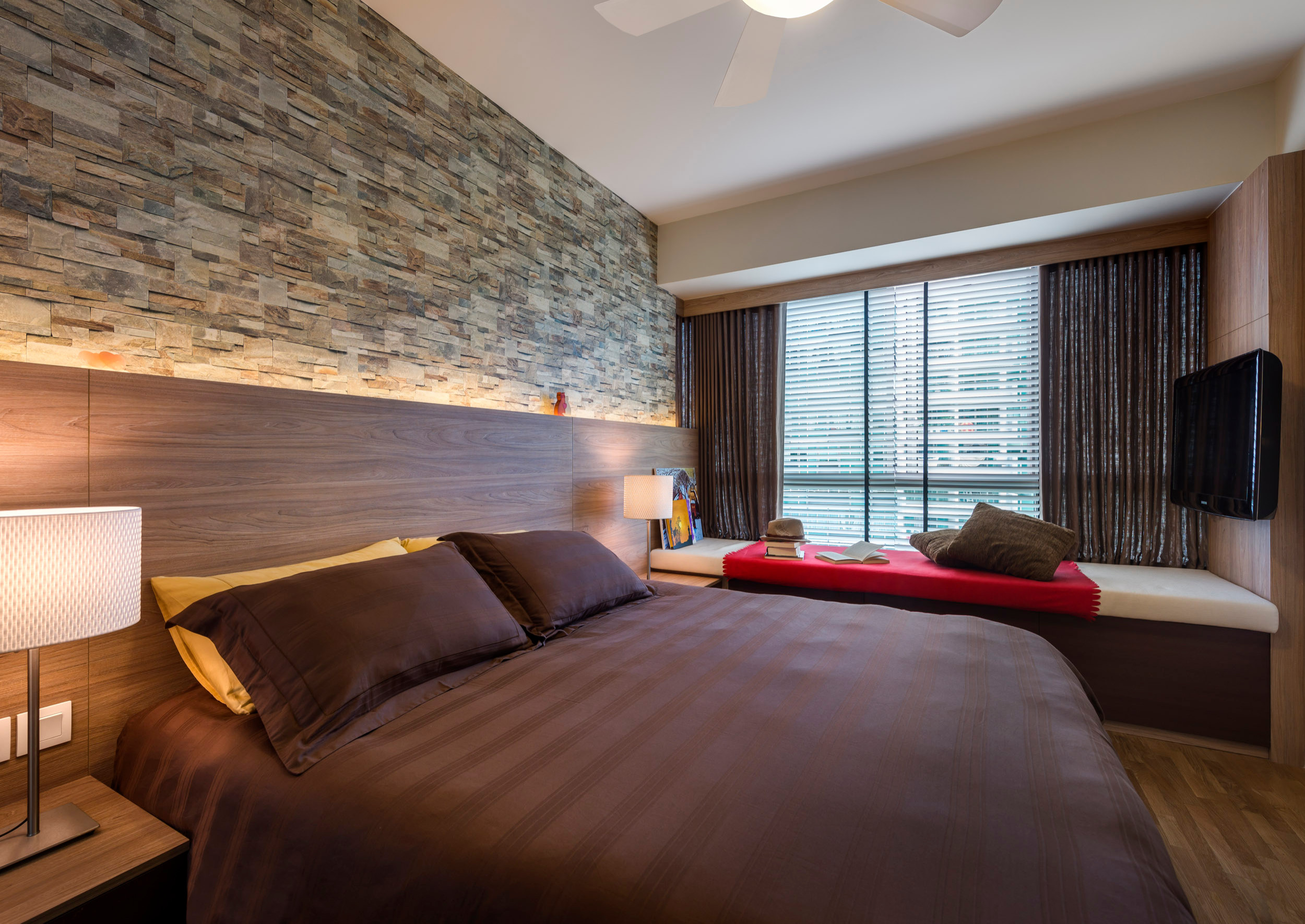 As built-in bay windows in Singapore condos go, you can’t tear it down or carve hidden storage units from it. In this bedroom, design firm Architology used the bay window as the base for an entertainment cabinet, on which the TV is perched (the cabinet conceals all the wiring and set-top boxes). The bay window is further disguised with a veneer finish similar to the built-in.