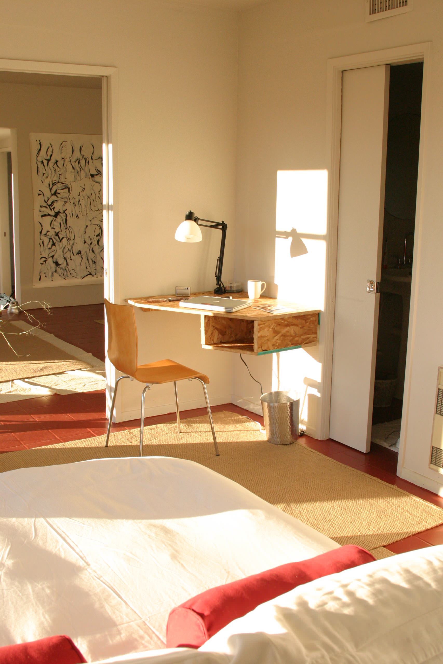 The corner of this bedroom in a guesthouse in Morongo Valley, Califoria, is a bit awkward – there’s not quite enough room for anything between wardrobe and door and it would otherwise sit there looking a bit blank. This dinky little writing desk – built from inexpensive strandboard, more commonly used for sub-flooring – artfully fills the corner. There’s just enough room for a laptop and a lamp. The angle of the desk ensures there’s still room to walk around the bed.