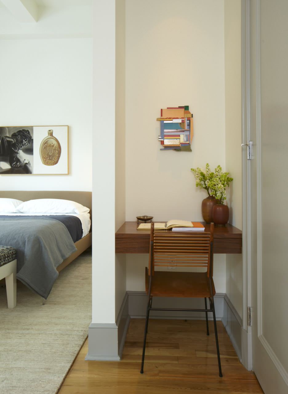 Similarly, this bedroom in a San Francisco loft conversion worked a tiny writing desk into an odd little space between door and wall in the entry to the bedroom.