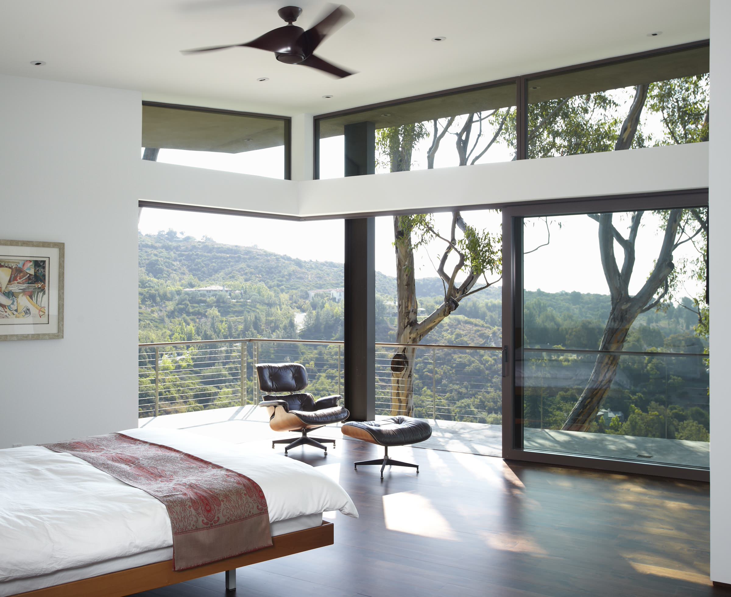 One of the easiest ways of making sense of that corner is to get a nice chair and put it in the corner. In this case, a classic Eames lounger and ottoman is the perfect accompaniment to doors that open up completely, and a wonderful view over Mandeville Canyon in Los Angeles.