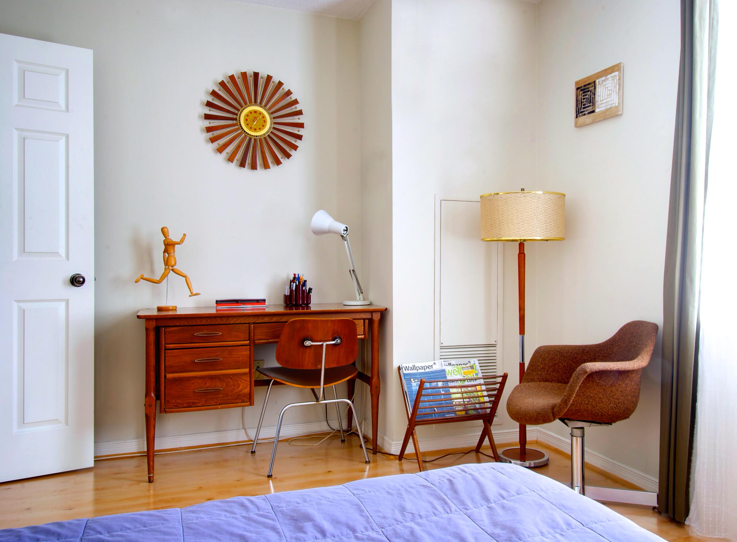 Ever had one of those awkward corners in a bedroom that has a box from a service riser, hot water cylinder or air conditioning unit? Most people have. Simply surrounding it with some artful mid-century furniture has worked well here – a nice wooden desk on one side, chair, magazine rack and lamp on the other.