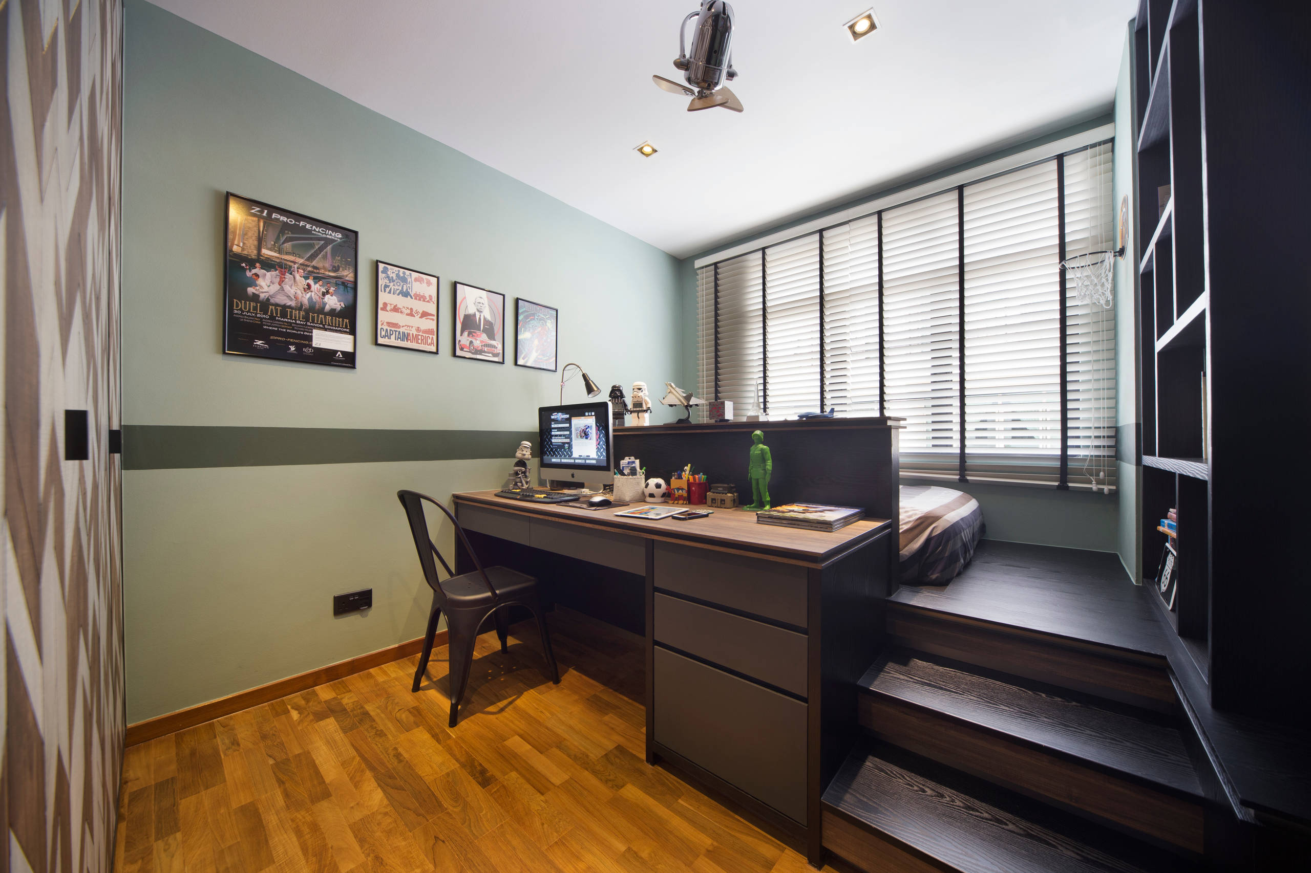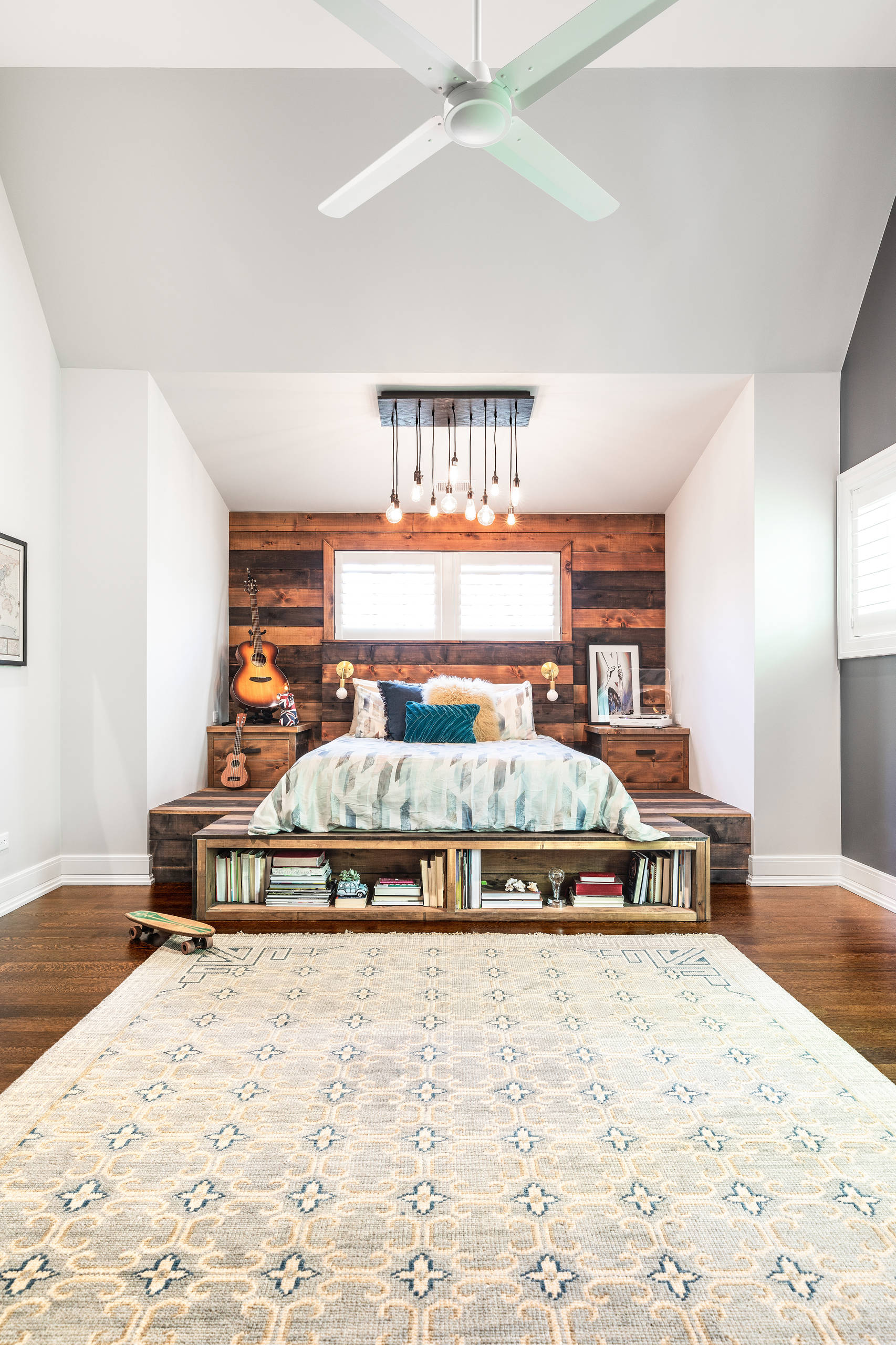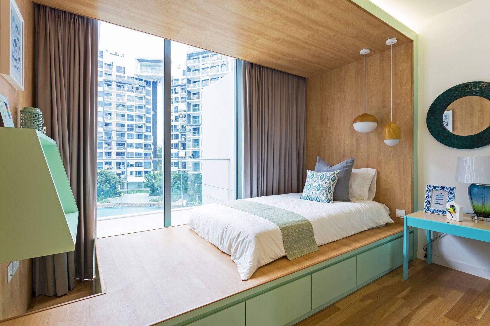 Features: The boxiness of the the bed and storage around it is delightfully countered by a hanging Bubble chair.