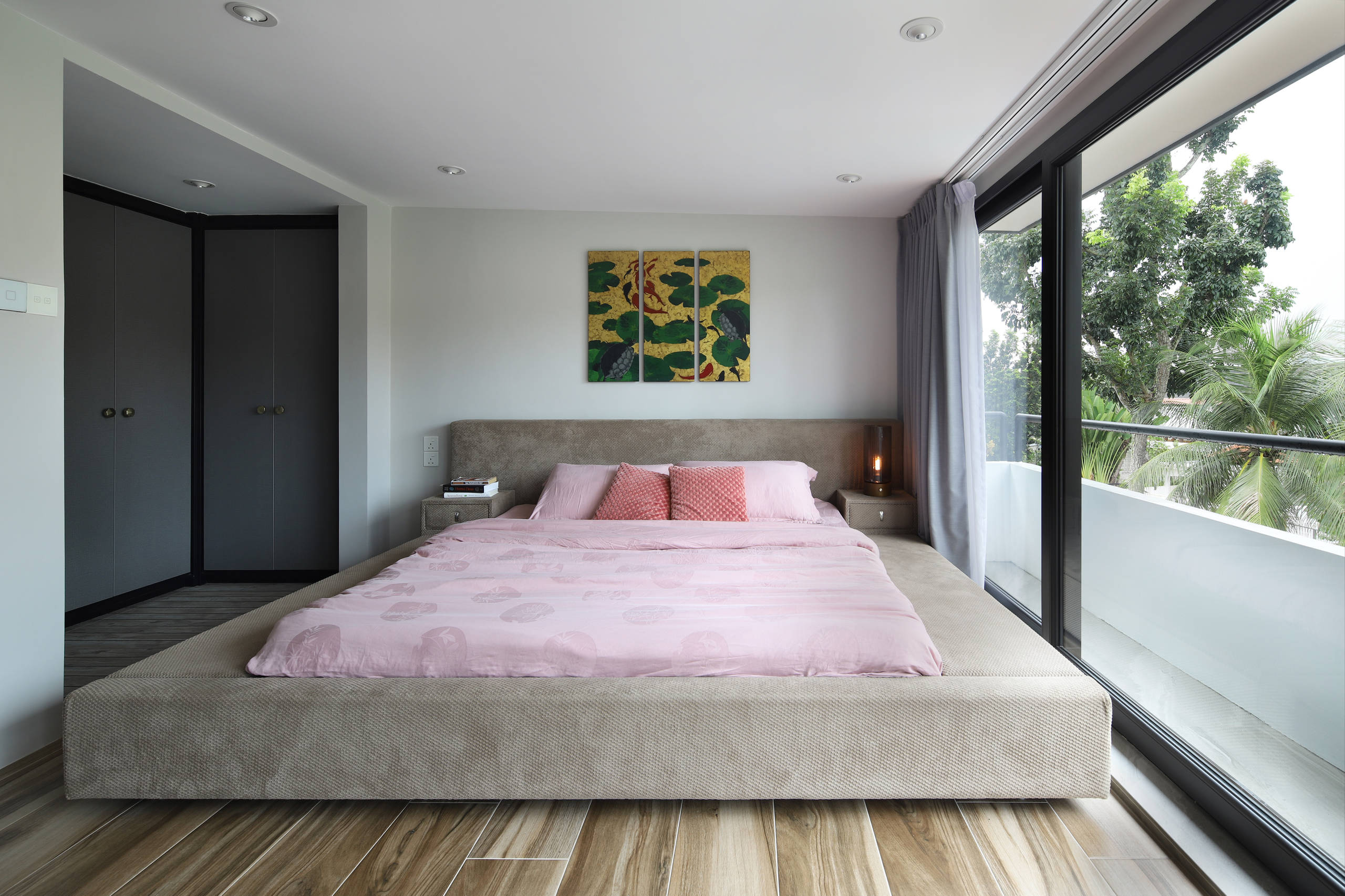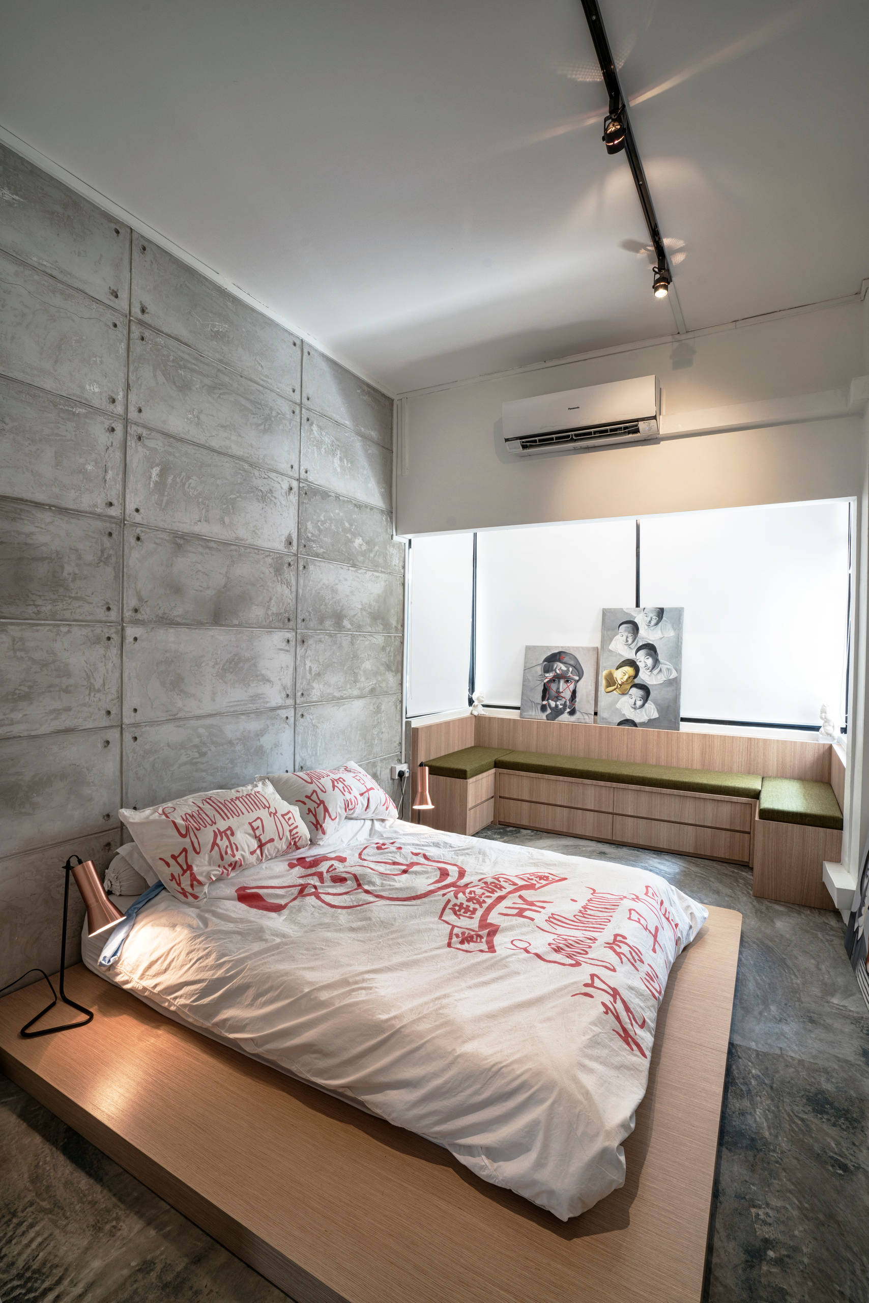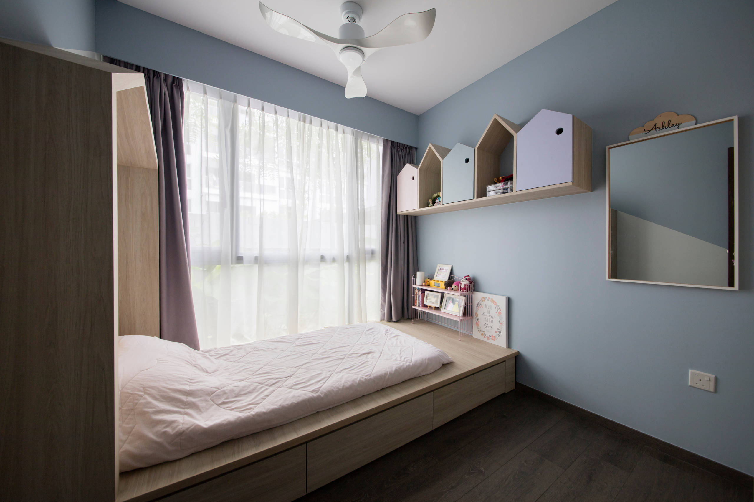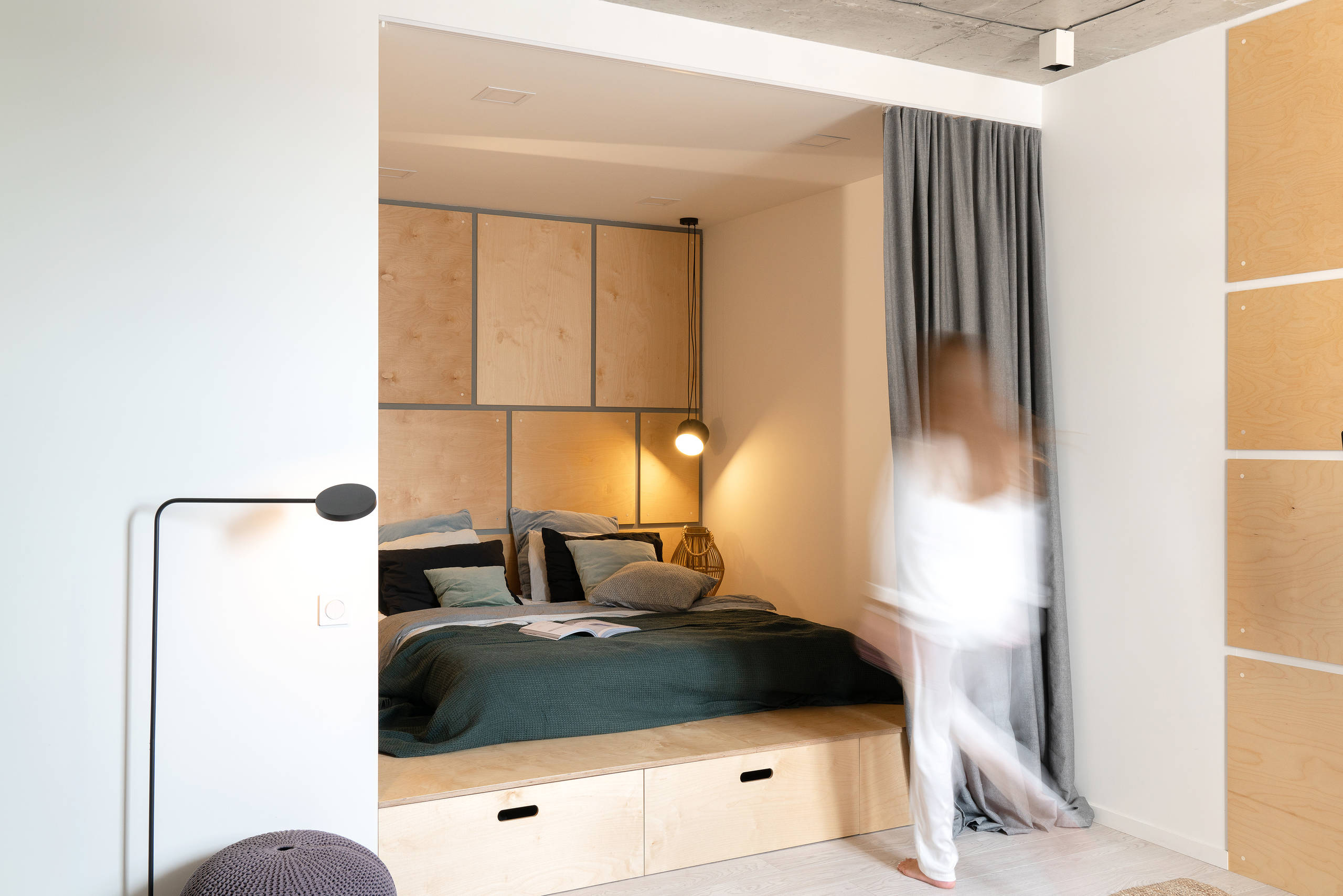Features: Pale timber to create under-bed storage and a bedhead with built-in lighting.