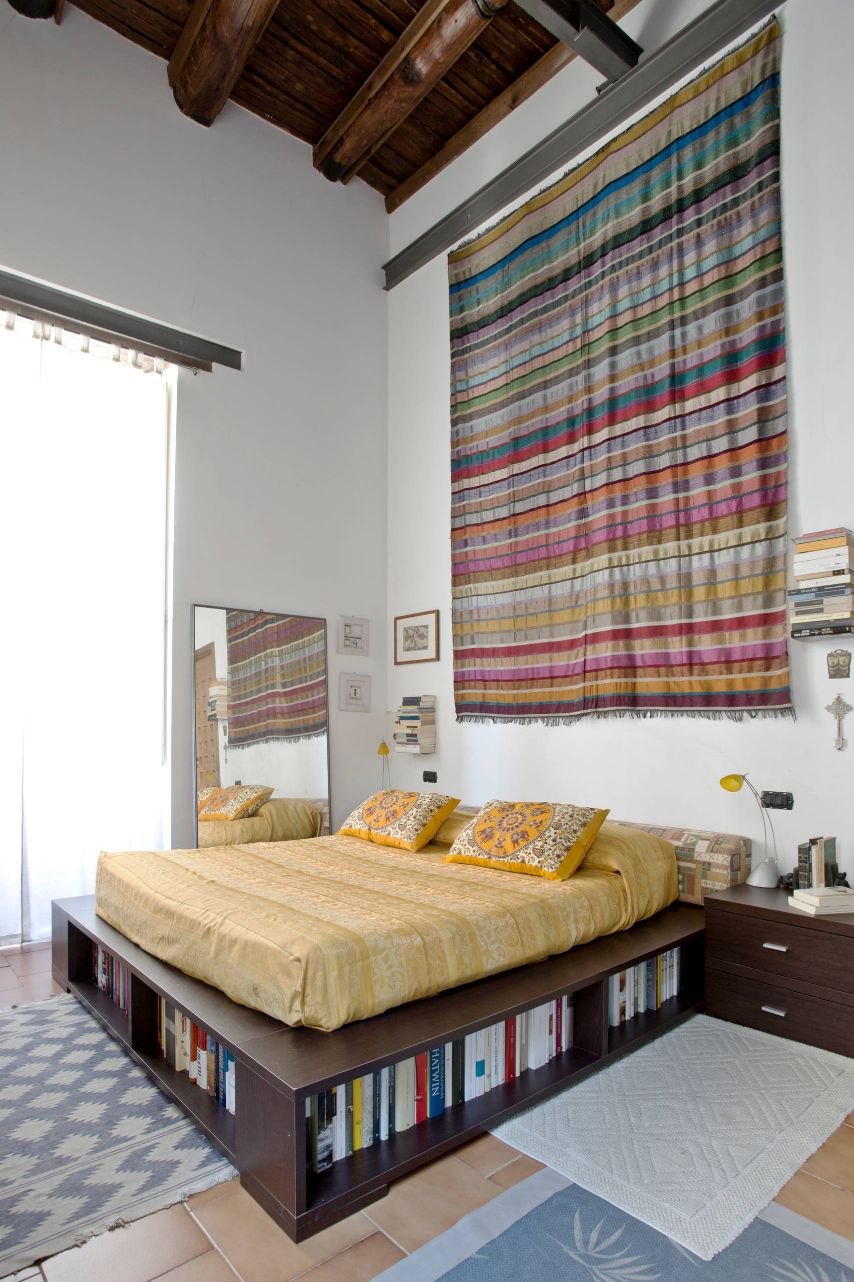 Features: Three sides of book storage – and an awesome wall hanging.