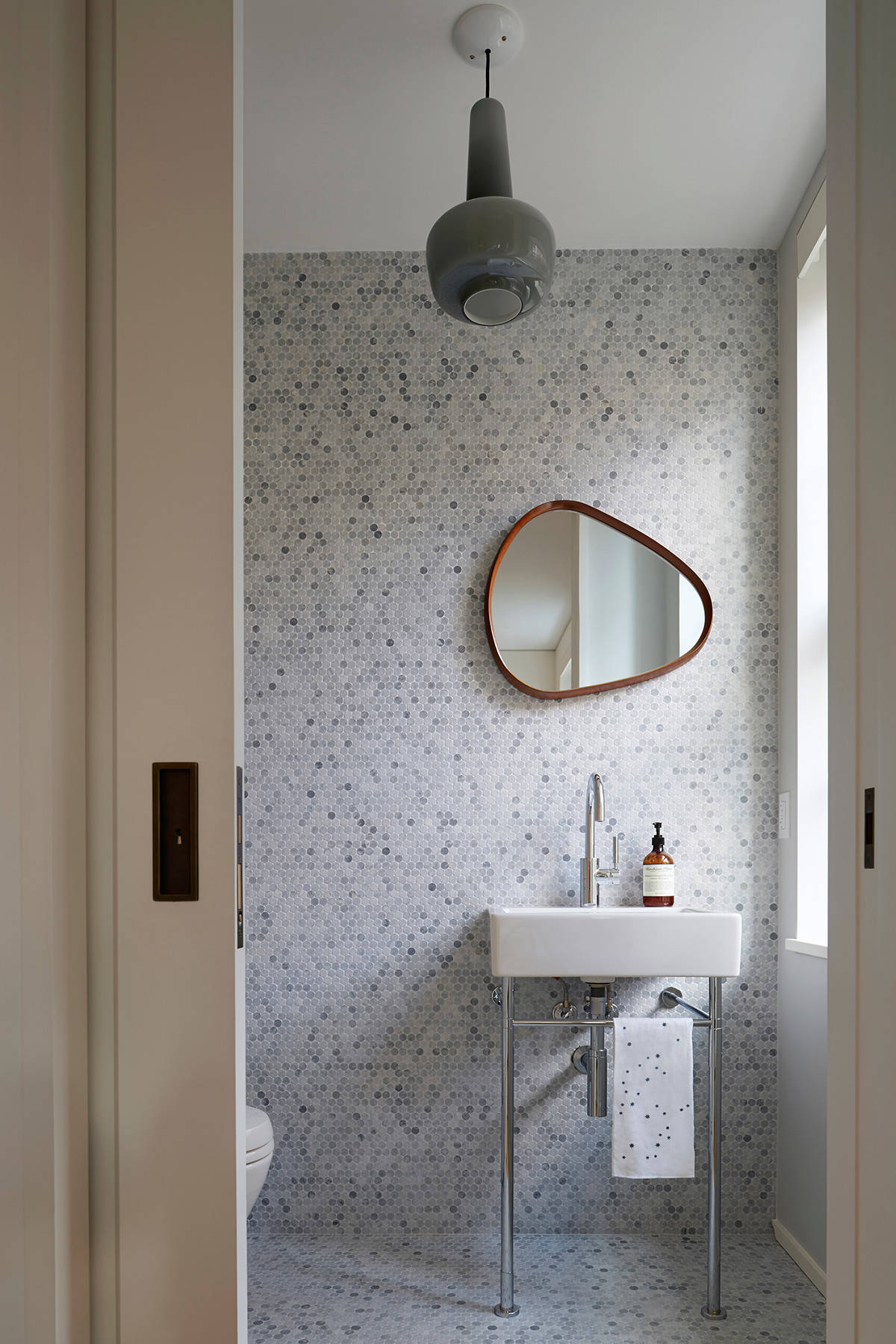 In general, mosaic makes a great counterpoint to larger tiles, because the dramatic shift in scale makes the mismatch clearly intentional. (Here a hexagonal mosaic beautifully contrasts oversize Corian planks.)