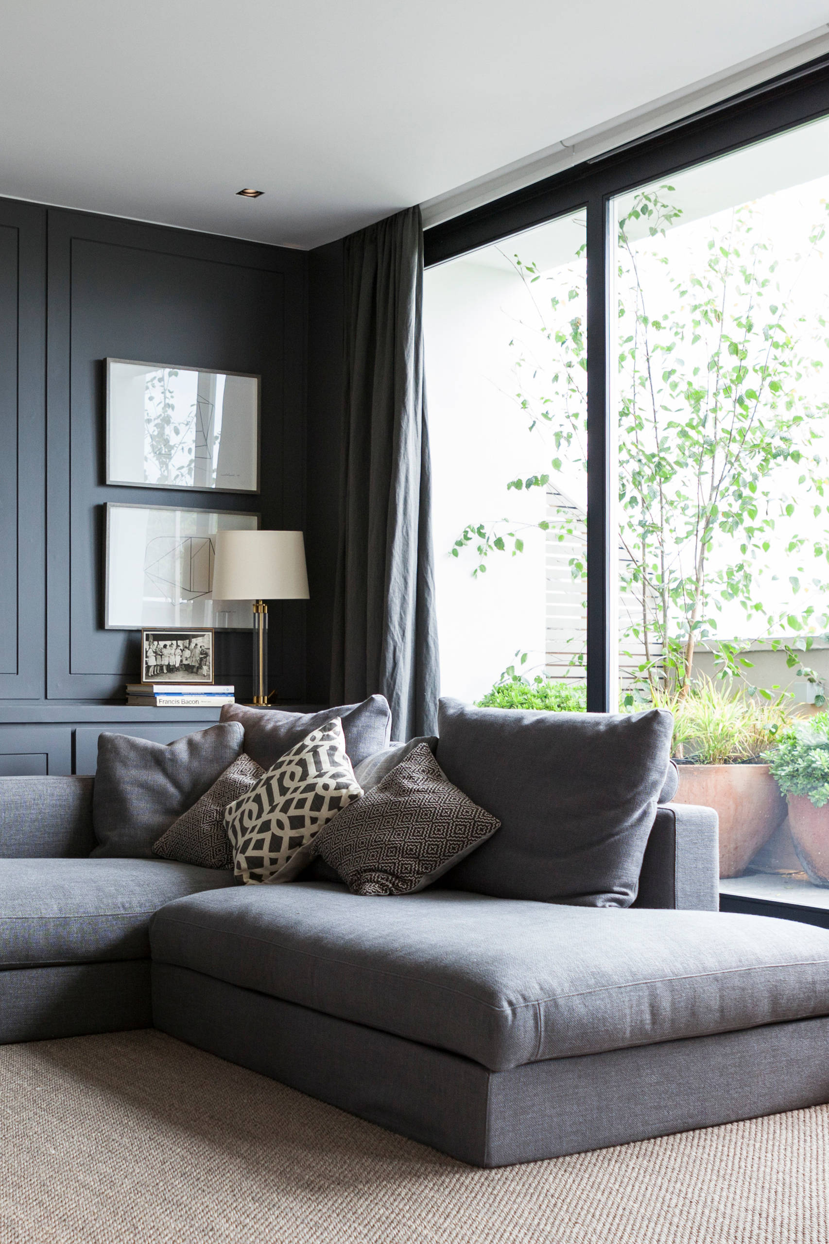 Here, the deep grey of the wall tends towards blue, creating colour a neutral-lover can appreciate while still complementing a mid-grey sofa, and steel grey window treatment. For a scheme with depth if you’re repeating this trick at home, think pattern, like these geometric motif cushions, and texture – here created by the carpet and linen look curtain.