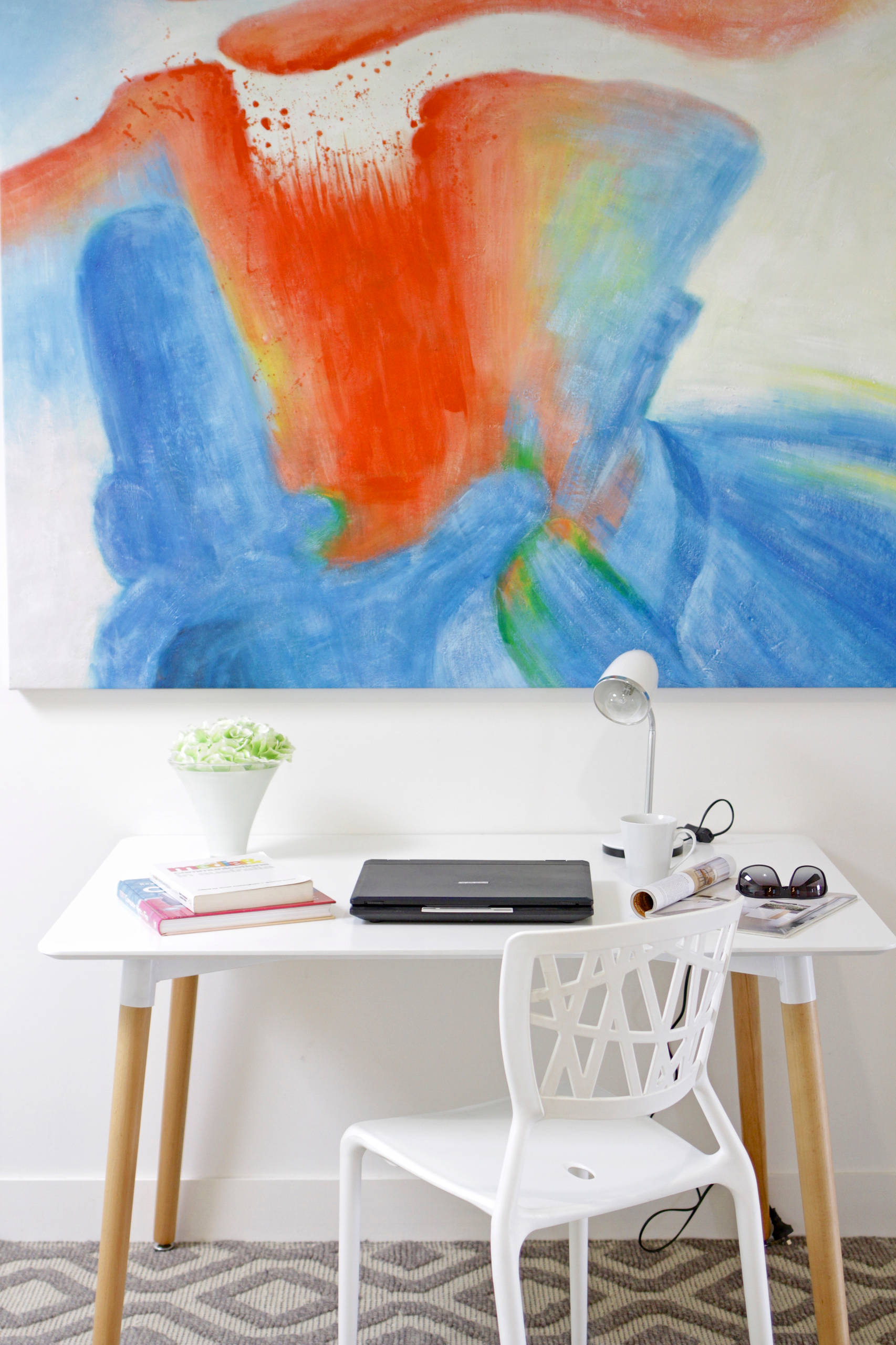 This artwork may create a brilliant burst of colour amongst the clean, quiet white and wood tones, but introducing it hasn’t involved changing the colour of walls or woodwork – meaning the look is still unfussy and the flooring is still neutral. The lesson? Introduce colour via art and your other half might be persuaded that it’s moveable and leaves the scheme beneath it like just as before.