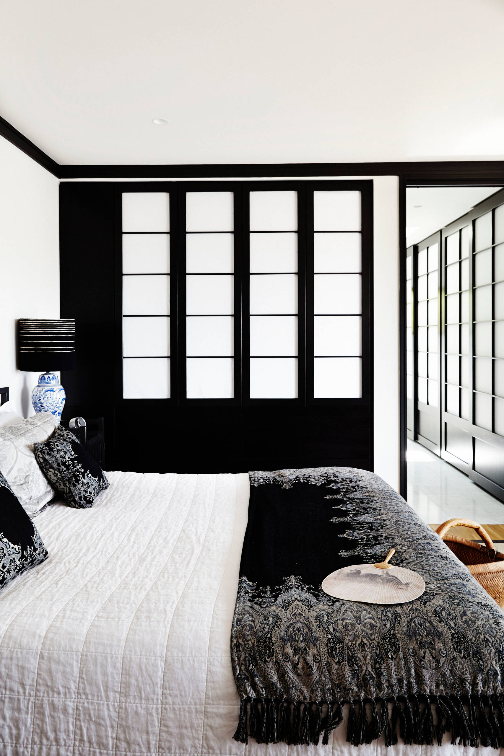 Linking the bed with its surrounds makes perfect sense in this Asian-feel bedroom. It also creates maximum impact with minimum fuss, which works well in what is a quite small room. The fringe on the blanket provides all the soft touch that is required.