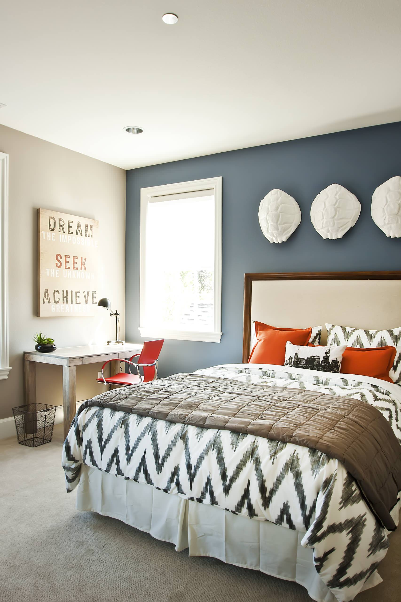 One good investment in a very cool quilt cover makes this room an instant success, especially with the well-placed touches of bright yellow to set off the whole thing. The quilted valance has a firm finish and warm texture, too.
