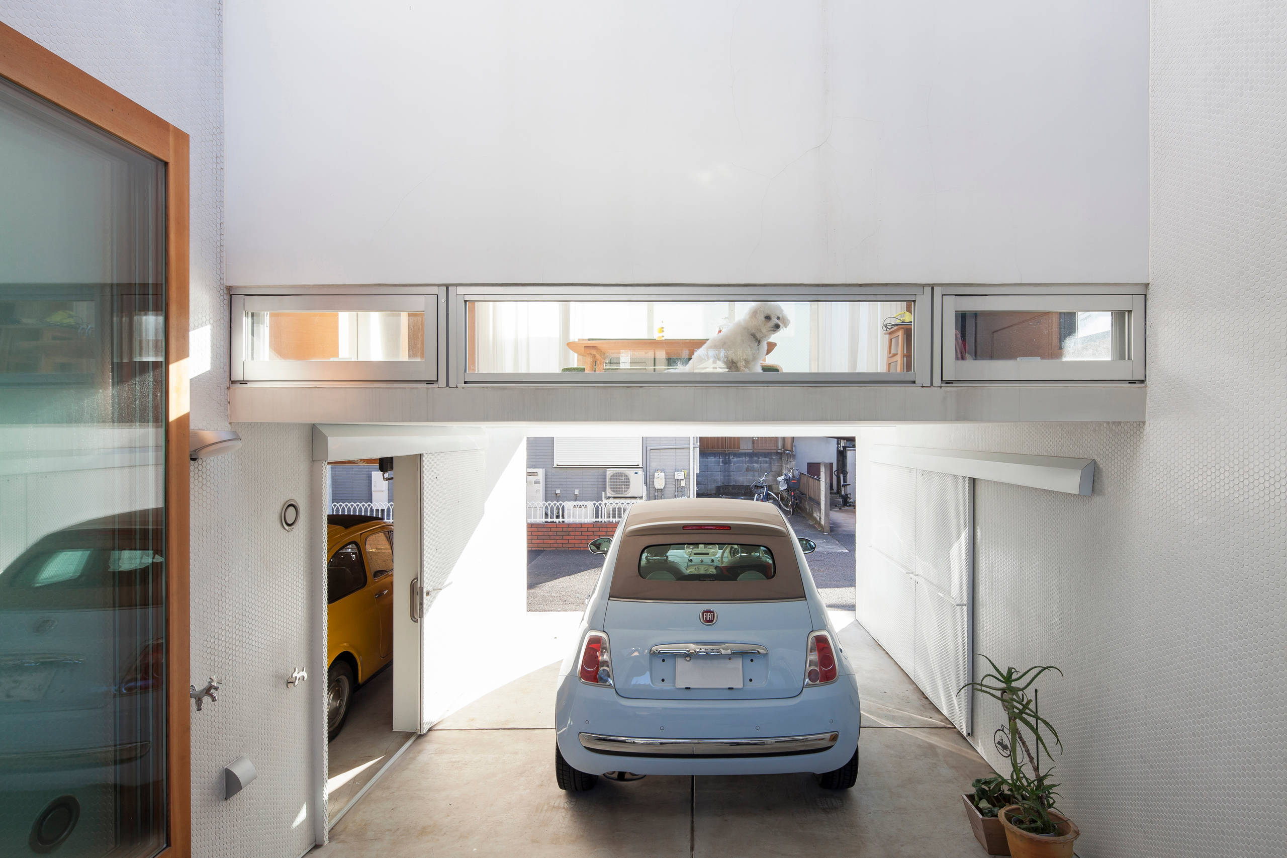A cleverly designed home such as this one in Japan, has allowed the homeowners the opportunity to get their car off the narrow street outside and park it safely in the house. Windows over the parking area provide another inhabitant, a cute little poodle, with a lookout from which to keep watch over the compact city car below. Perhaps it’s waiting to be taken out for a drive?