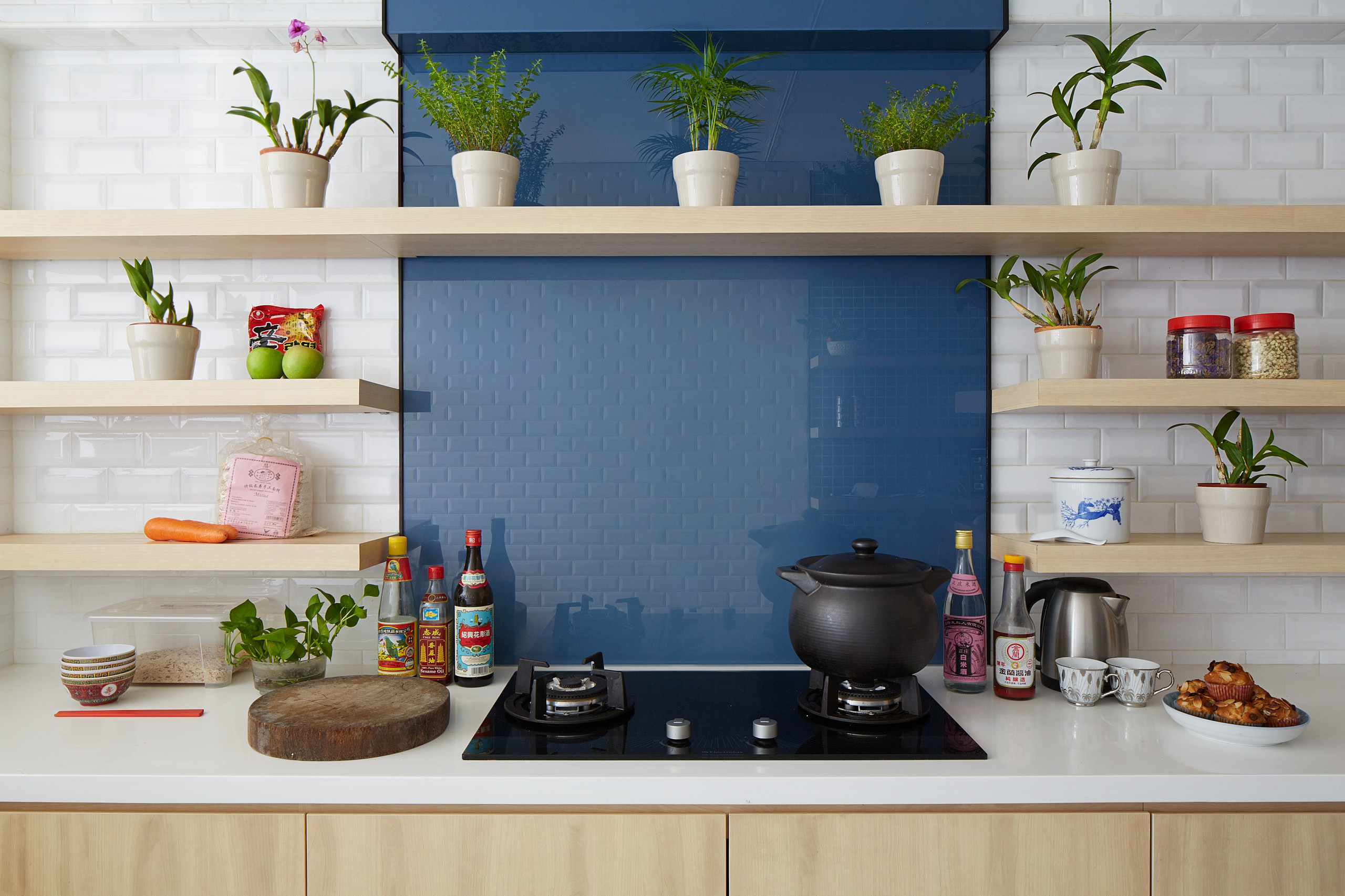 Open shelves are preferred over solid doors. “They [visually] remind you where things are placed,” shares Taher.