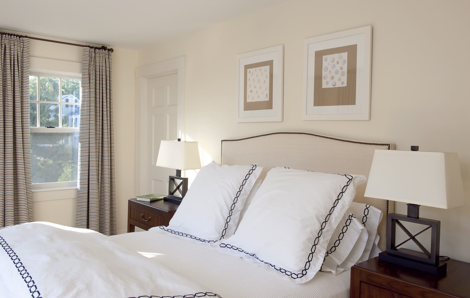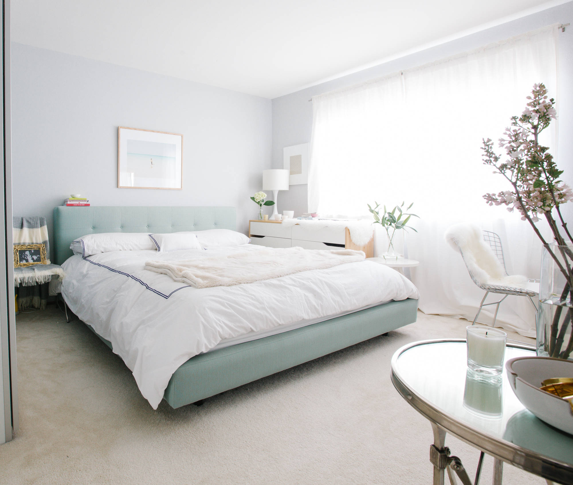 A chair in the bedroom is a convenient place for tossing extra pillows before climbing into bed. If you don’t have room for a chair, try to find another nearby spot to keep pillows and extra covers off the floor – perhaps on a dressing table or in a basket behind the door.