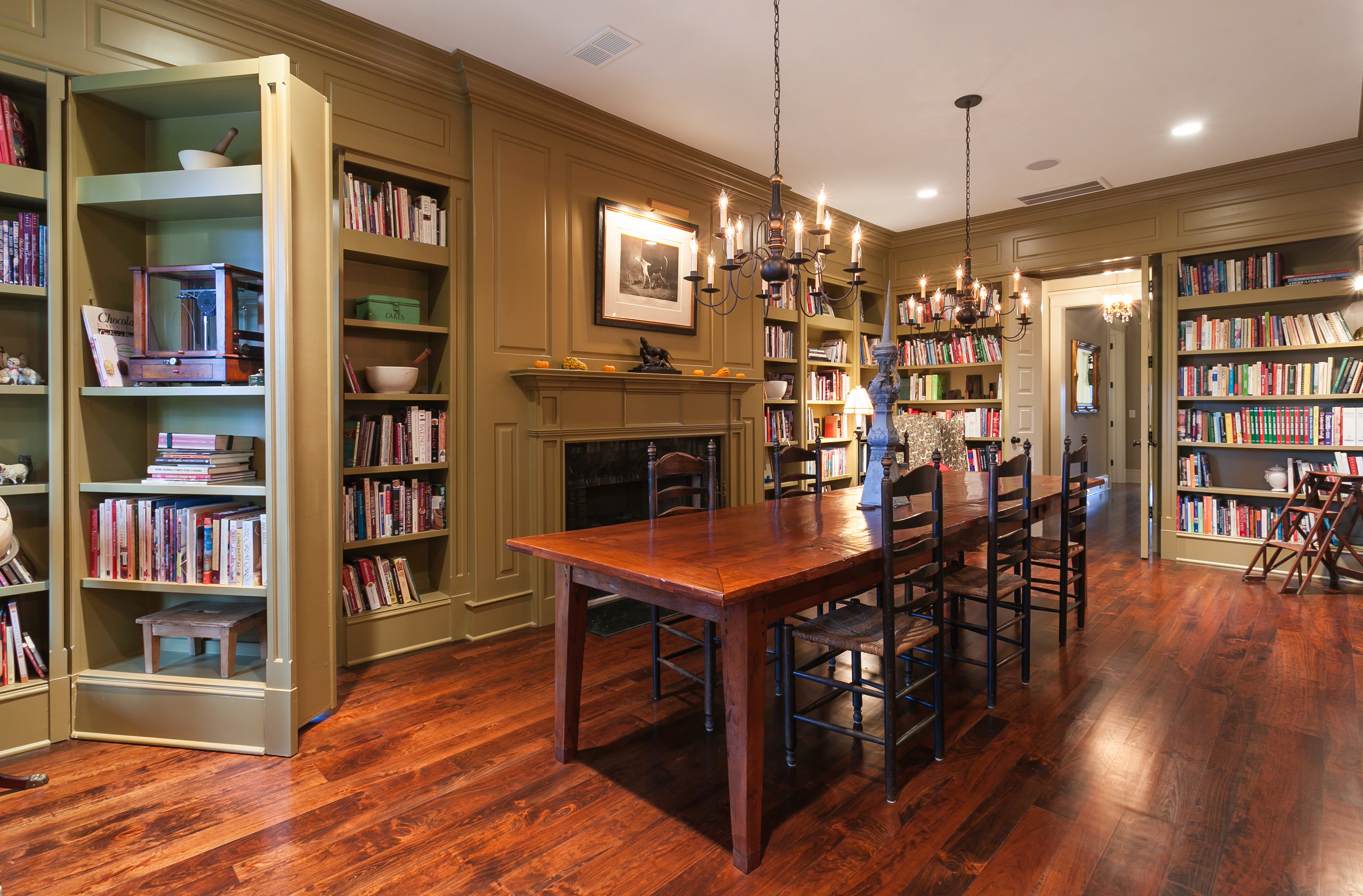 Hogwarts is full of tunnels and secret spaces, revealed by the Marauder’s Map. Here, built-in bookcases swing open to a hidden room adjacent to a dining space.